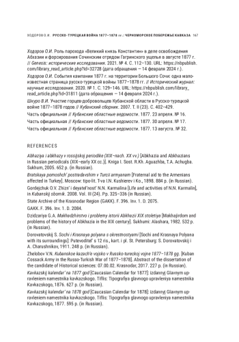 29. Ходоров О.И. События кампании 1877 г. на территории Большого Сочи: одна малоизвестная страница русско-турецкой войны 1877-1878 гг. // Исторический журнал: научные исследования. 2020. № 1. С. 129-146. URL: https://nbpublish.com/library_read_article.php?id=31811 (дата обращения - 14 февраля 2024 г.). EDN: VKWTMG