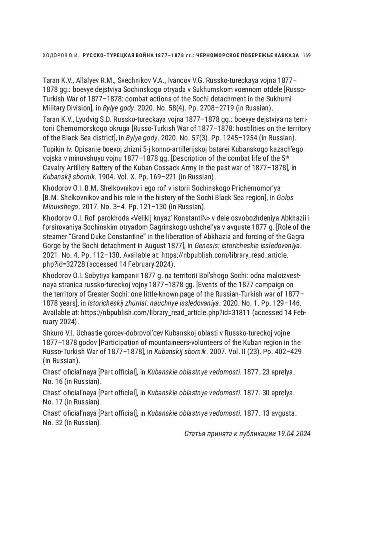 24. Таран К.В., Аллалыев Р.М., Свечников В.А., Иванцов В.Г. Русско-турецкая война 1877-1878 гг.: боевые действия Сочинского отряда в Сухумском военном отделе // Былые годы. 2020. № 58(4). С. 2708-2719. EDN: YYTTMB