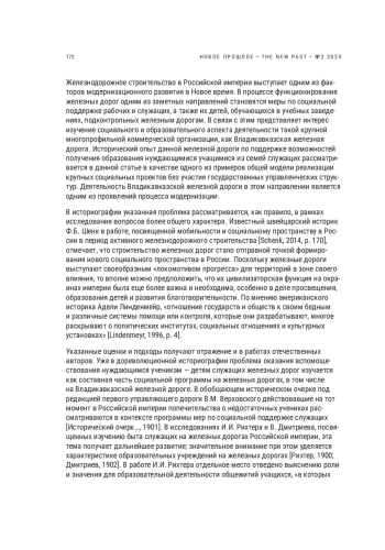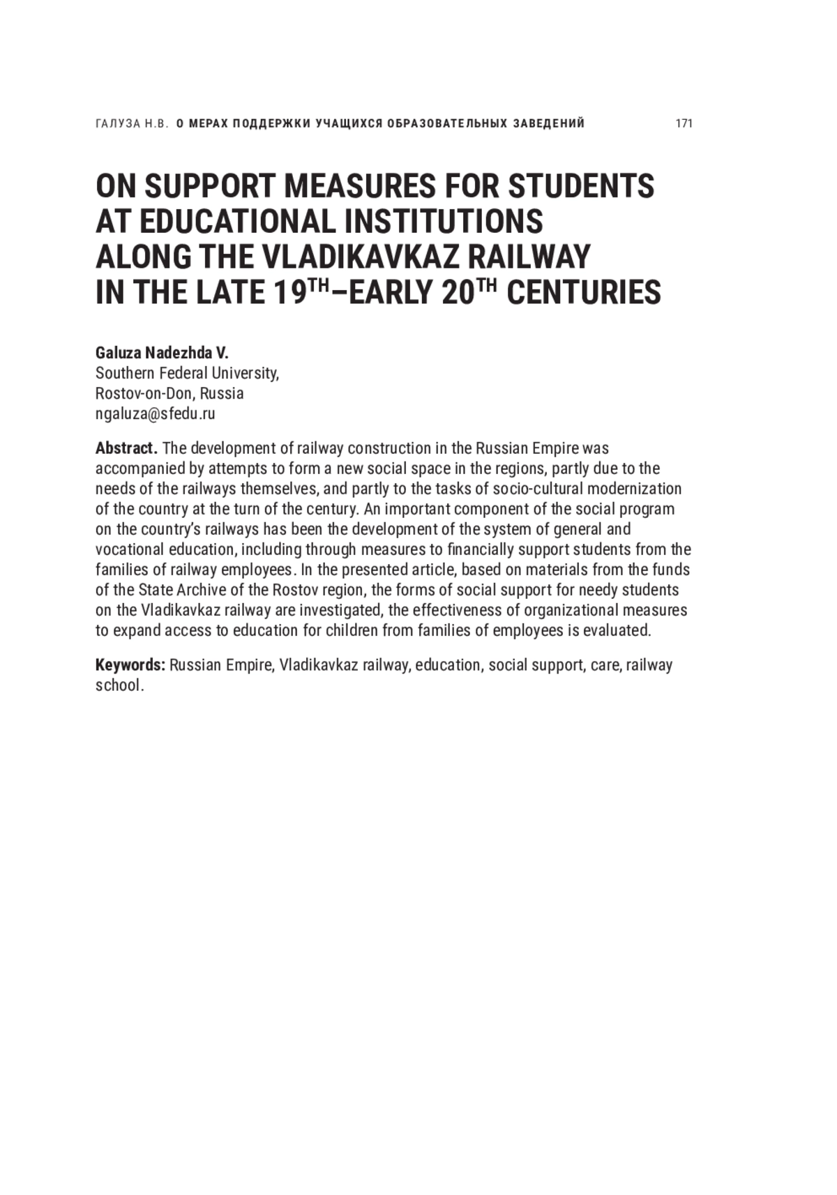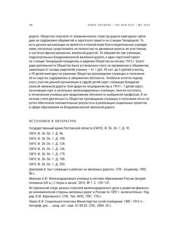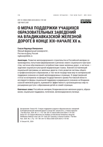 Развитие железнодорожного строительства в Российской империи сопровождалось попытками формирования в регионах нового социального пространства, частично обусловленного потребностями самих железных дорог, а частично — задачами социально-культурной модернизации страны. Важной составляющей социальной программы на железных дорогах стало развитие системы общего и профессионального образования, в том числе посредством мер по материальной поддержке учеников из семей железнодорожных служащих. В представленной статье на материалах из фондов Государственного архива Ростовской области исследуются формы социальной поддержки нуждающихся учеников на Владикавказской железной дороге, оценивается эффективность организационных мер по расширению доступа к образованию детей из семей служащих