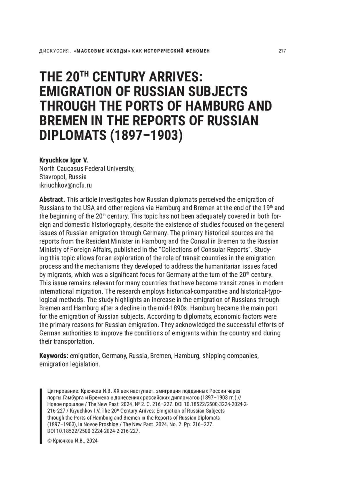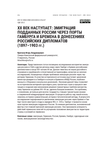 Представленная статья посвящена исследованию восприятия эмиграции россиян в США и другие регионы мира через Гамбург и Бремен российскими дипломатами в конце XIX–начале ХХ вв. Данная тематика не нашла достойного отражения в зарубежной и отечественной историографии, несмотря на наличие исследований, посвященных общим проблемам эмиграции россиян через территорию Германии. В качестве исторического источника выступают донесения министра-резидента в Гамбурге и консула в Бремене в МИД России, опубликованные в «Сборниках консульских донесений». Изучение данной темы позволяет на историческом материале проследить роль транзитных стран в процессе эмиграции и создания ими механизмов решения гуманитарных проблем мигрантов, чему Германии на рубеже XIX–XX вв. уделяла большое внимание. Эта проблема, к сожалению, актуальна для многих государств, ставших транзитными зонами в современной международной эмиграции. В процессе работы над темой использовались историко-сравнительный, историко-типологический методы. В результате исследования подчеркивается увеличение эмиграции россиян через Бремен и Гамбург после некоторого спада в середине 90-х гг. XIX в. Гамбург становится основным портом эмиграции подданных России. По мнению дипломатов, экономический фактор стал главной причиной эмиграции россиян. Они признавали успешность действий германских властей по улучшению положения эмигрантов на территории страны и условий их перевозки