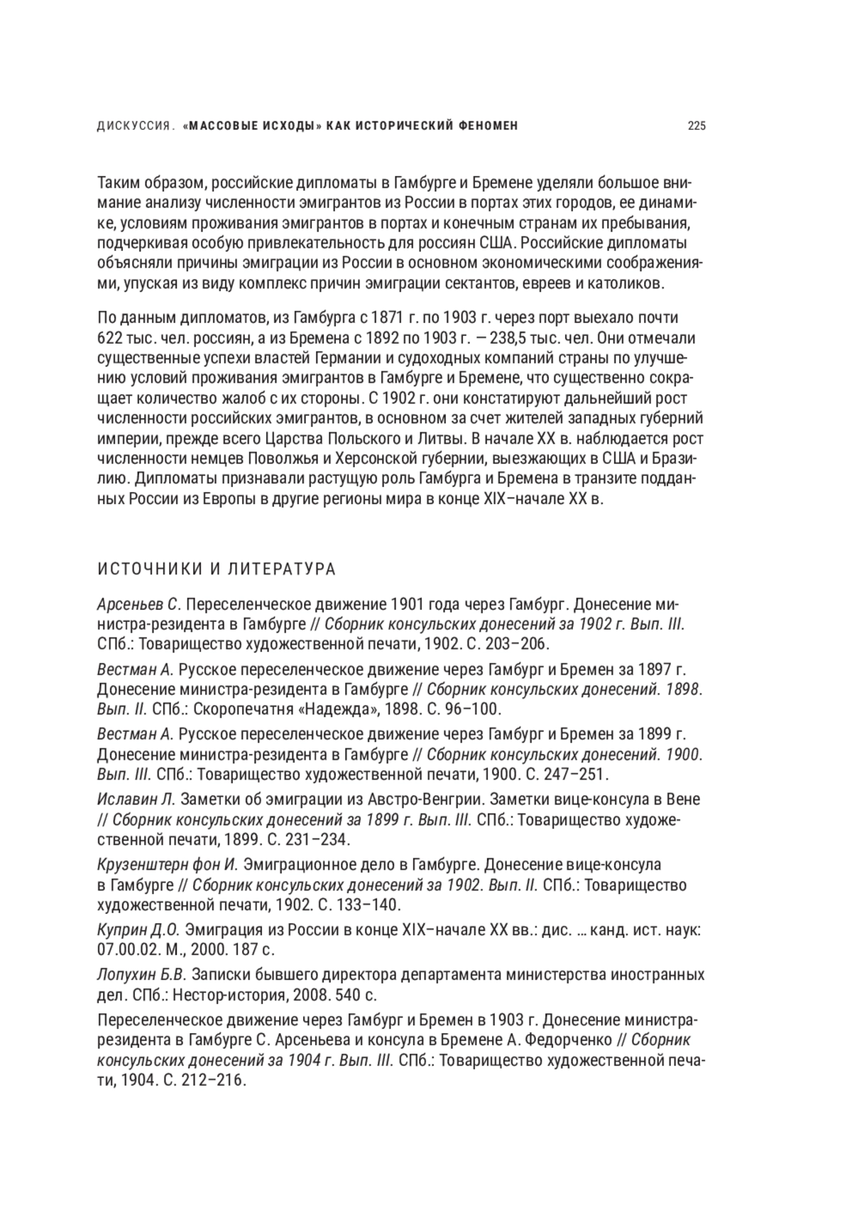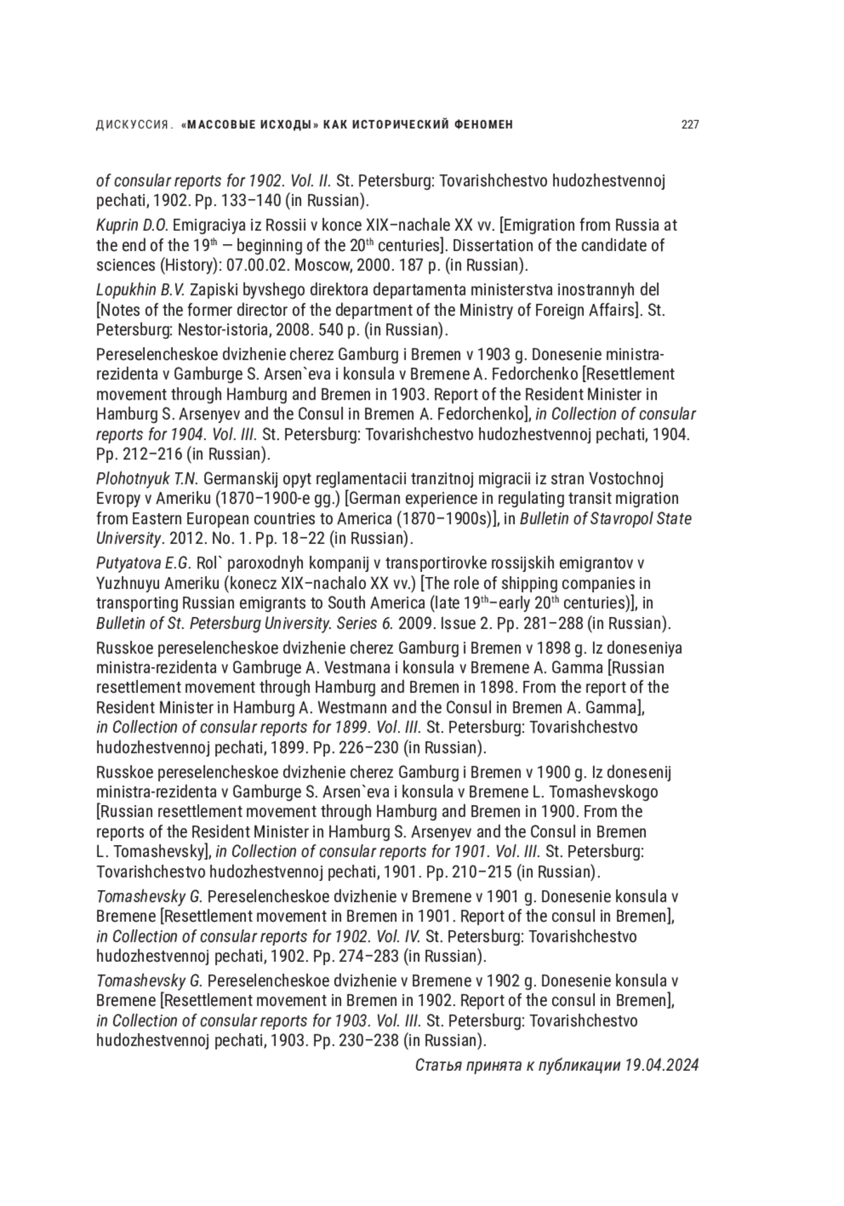 12. Русское переселенческое движение через Гамбург и Бремен в 1900 г. Из донесений министра-резидента в Гамбурге С. Арсеньева и консула в Бремене Л. Томашевского // Сборник консульских донесений за 1901. Вып. III. СПб.: Товарищество художест-венной печати, 1901. С. 210-215.