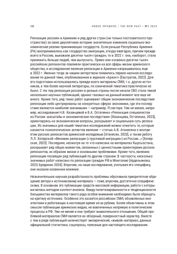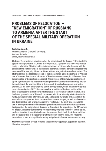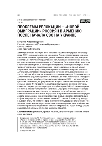 Реакция некоторой части населения Российской Федерации на начавшуюся в 2022 г. специальную военную операцию на Украине породила новое социальнополитическое явление — релокацию. Данным термином обозначается перемещение несогласных с политикой государства либо испытывающих экономические проблемы его граждан за границу с сохранением их образа жизни, быта и занятий, без интеграции в принимающее общество. В настоящем исследовании рассматривается суть и логика указанного явления на примере Армении — одного из главных на данный момент направлений релокации россиян; рассмотрены его отличия от эмиграции прошлого. Актуальность исследования предопределена значением описываемого явления как для российского общества, так и для обществ принимающих стран. В данном контексте Армения также предстает характерным примером. Вместе с тем, учитывая «молодость» проблемы, которая приобрела серьезные масштабы лишь с 2022 г., научных публикаций по ней крайне мало, а в фокус внимания историка тема нашего исследования не попадала вовсе. Это приводит к большей ориентации данной работы на источники, в качестве которых предстают прежде всего публикации в СМИ, собственные опросы и интервью, а также статистические материалы. Специфика источниковой базы предполагает ориентацию на методы контент-анализа, а также наблюдения и непосредственного контакта с носителями информации. Направленность исследования предполагает и использование сравнительного метода при оценке особенностей релокации на фоне эмиграции россиян в Армению в начале XX столетия. В итоге автор приходит к выводам о том, что, несмотря на ряд схожих моментов, современная релокация— качественно новое явление, обусловленное как влиянием времени, так и особенностью психологии российского креативного класса. Сами релоканты в свою очередь способны оказать значительное влияние на армянское общество