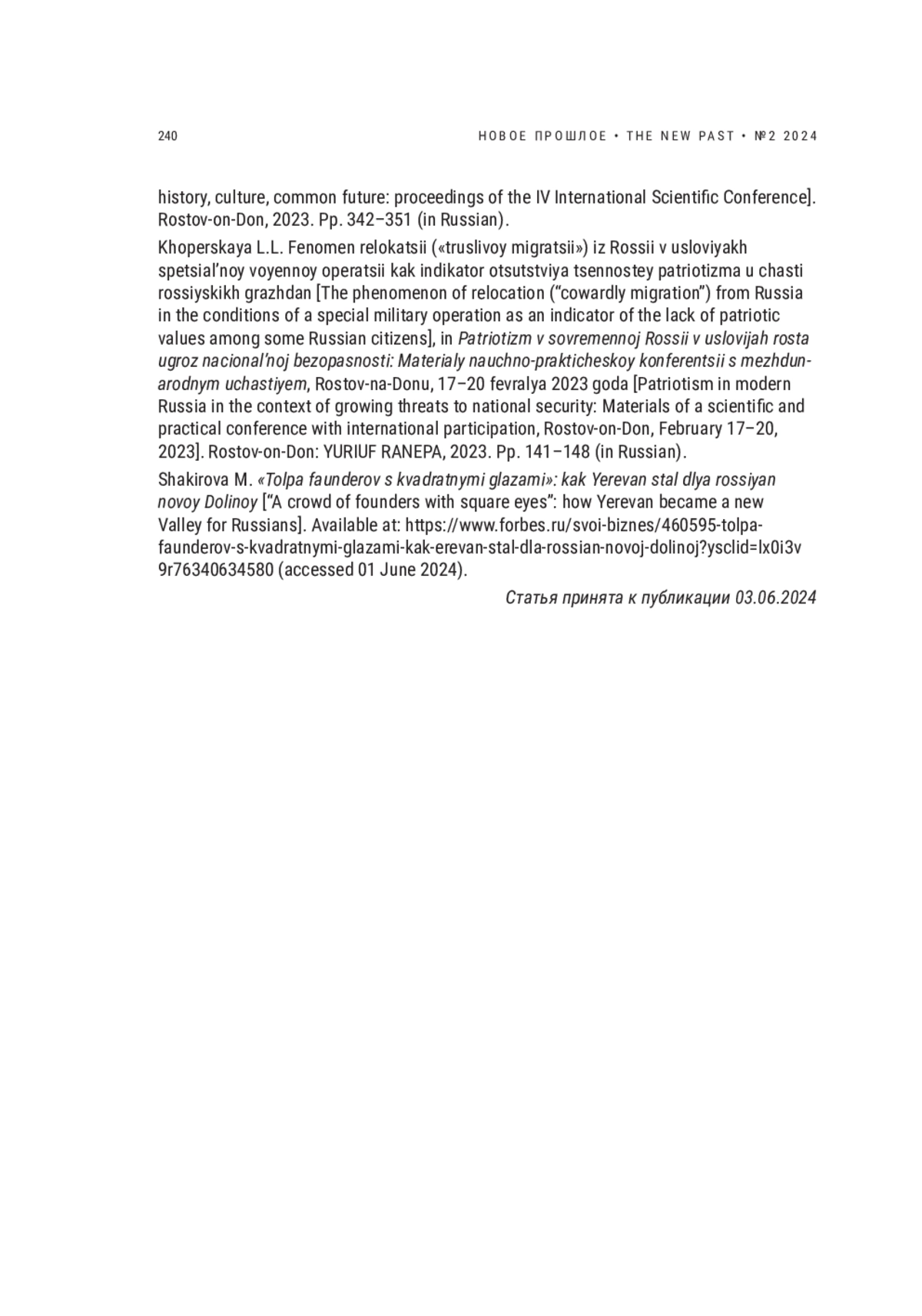 12. Хоперская Л.Л. Феномен релокации (“трусливой миграции”) из России в условиях специальной военной операции как индикатор отсутствия ценностей патриотизма у части российских граждан // Патриотизм в современной России в условиях роста угроз национальной безопасности: Материалы научно-практической конференции с международным участием, Ростов-на-Дону, 17-20 февраля 2023 года. Ростов-на-Дону: ЮРИУФ РАНХиГС, 2023. С. 141-148.