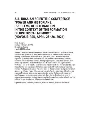 В статье представлен обзор Всероссийской научной конференции «Власть и историки: проблемы взаимодействия в контексте формирования исторической памяти», которая прошла в Новосибирске 23–24 апреля 2024 г. Конференция была организована Институтом истории Сибирского отделения РАН и редакцией электронного научного журнала «Исторический курьер», в ее работе приняли участие 26 исследователей из разных регионов Российской Федерации и ближнего зарубежья. Целью конференции являлось обсуждение исторического опыта и проблем взаимоотношений между властью и профессиональными историками, связанных с формированием исторической памяти. Участники обсудили меры по организации государством исторических исследований на разных этапах имперского периода российской истории, рассмотрели различные аспекты управления историческими исследованиями со стороны коммунистической власти и особенности реагирования историков, а также анализировали направления взаимодействия современных профессиональных исследователей с властью и общественностью в России, Италии, Франции, Узбекистане и Казахстане