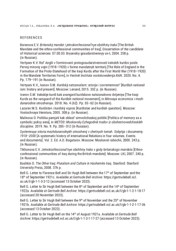 Статья посвящена анализу восприятия курдского вопроса в период формирования подмандатного государства Ирак через обращение к личному архиву британской путешественницы и разведчицы Арабского бюро Гертруды Маргарет Белл (1868–1926). Интерес к трудам разведчицы приобретает особую актуальность в контексте критической интерпретации событий данного периода в курдском национальном дискурсе XXI в., лейтмотивом которого является «насильственное» включение провинции в состав Ирака. Так, необходимость присоединения Курдистана к иракскому государству Г. Белл видела в разобщенности курдских территорий как между центрами провинции, так и ввиду замкнутости «окраин», не принимавших участия в политической жизни. Помимо этого, Г. Белл акцентирует внимание на экономической взаимозависимости Курдистана и Ирака, что способствовало добровольному сотрудничеству части курдских территорий с Багдадом. Исходя из этого, в своих текстах Белл уравнивает курдские и арабские национальные интересы. В то же время письма Г. Белл демонстрируют отсутствие конкретики относительно «курдского будущего» не только в планах местных жителей, но и в стратегии Уайтхолла. Таким образом, письма и труды Гертруды Белл подчеркивают многофакторность курдского вопроса, а также демонстрируют невозможность рассмотрения курдов исключительно в роли «инертных» участников межэтнических отношений