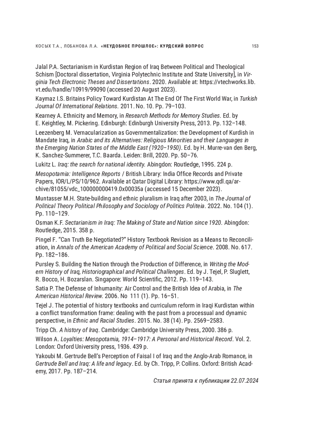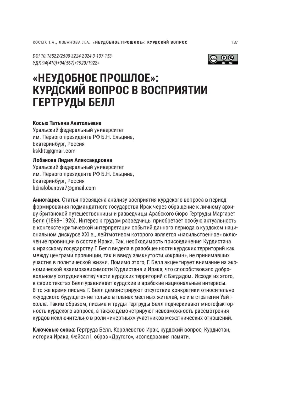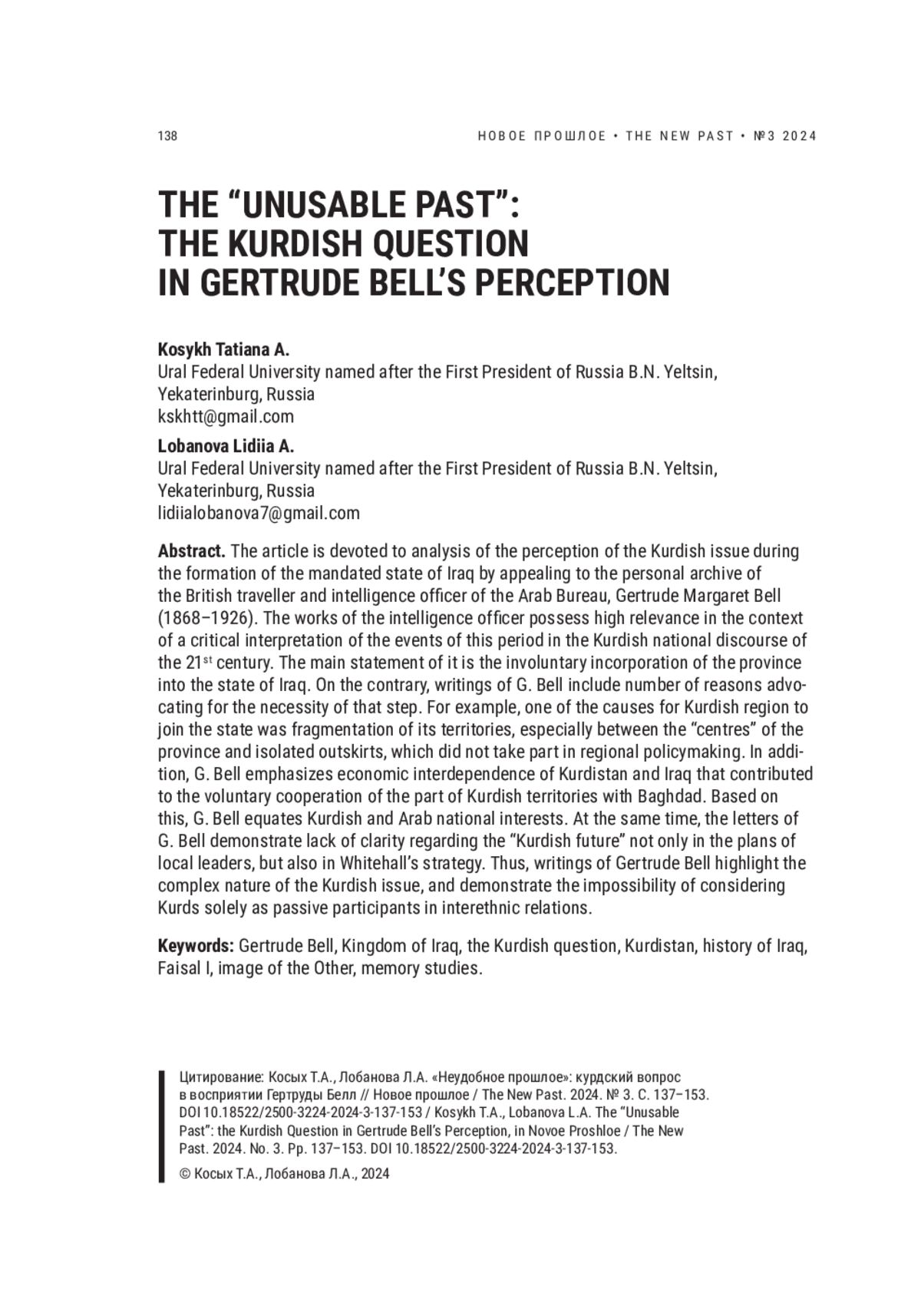 КОСЫХ Т. А., ЛОБАНОВА Л. А. "НЕУДОБНОЕ ПРОШЛОЕ": КУРДСКИЙ ВОПРОС В ВОСПРИЯТИИ ГЕРТРУДЫ БЕЛЛ // НОВОЕ ПРОШЛОЕ. 2024. № 3