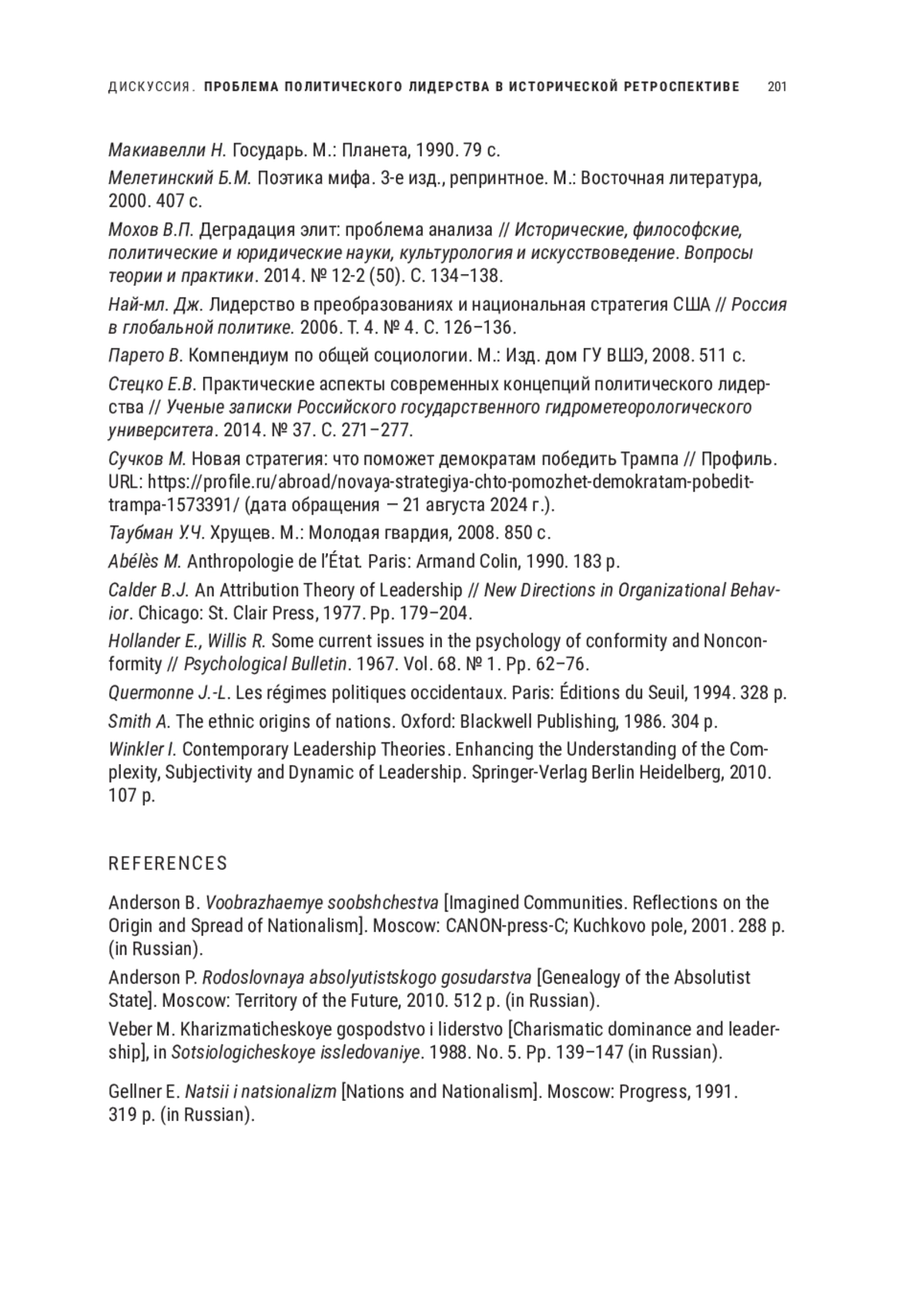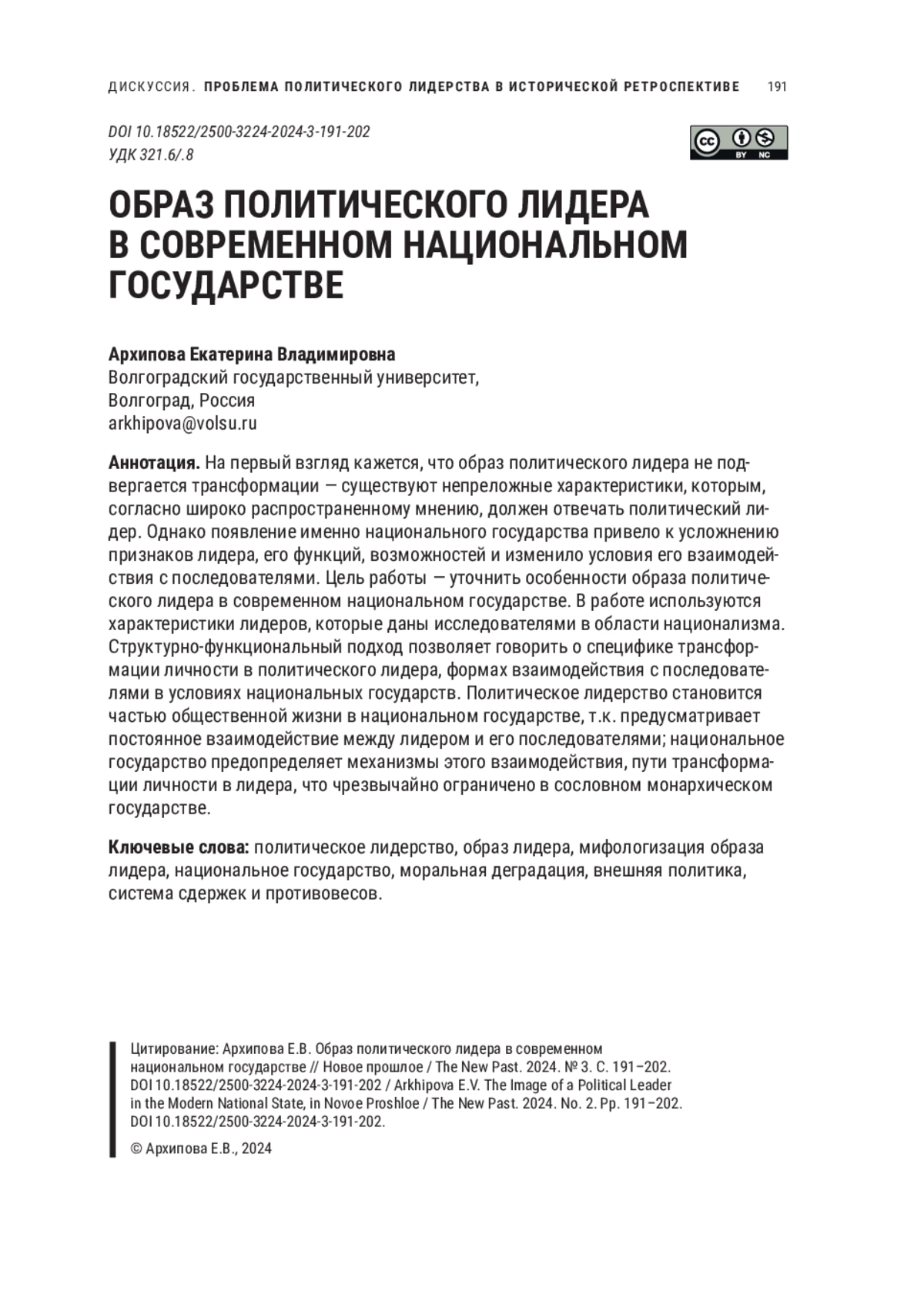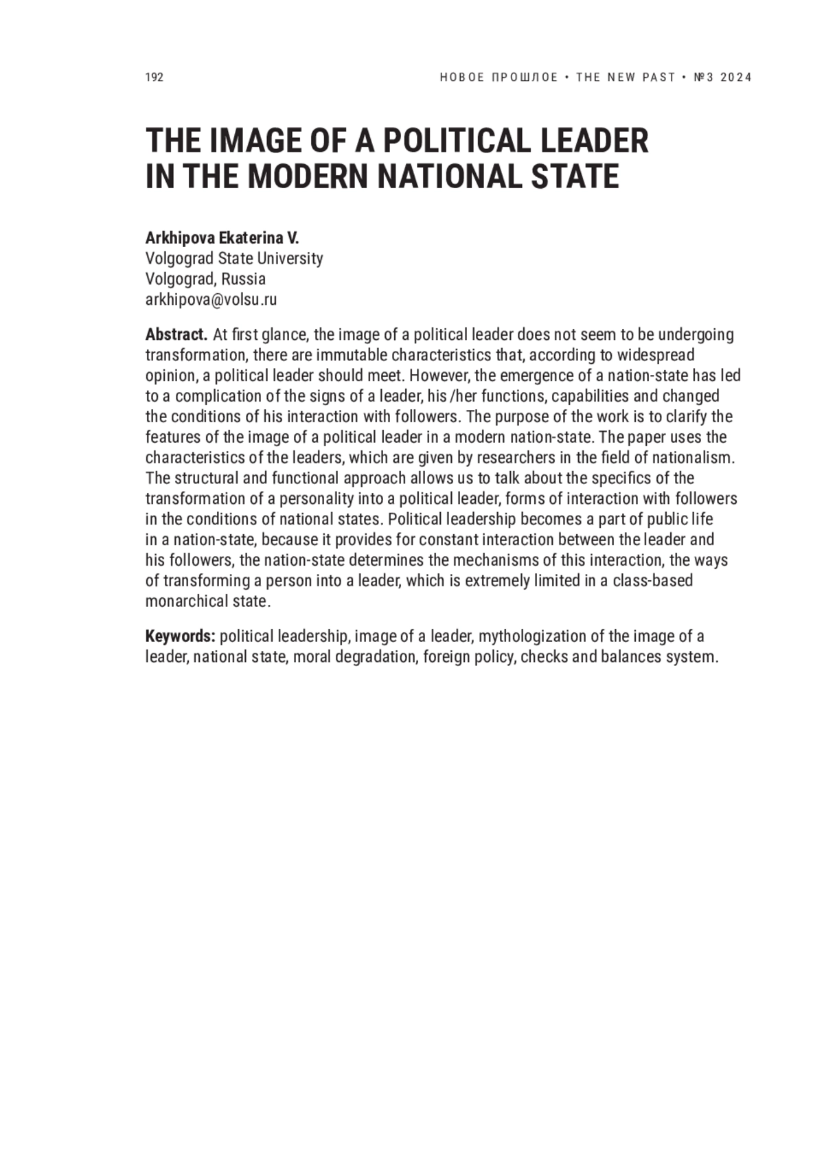 АРХИПОВА Е. В. ОБРАЗ ПОЛИТИЧЕСКОГО ЛИДЕРА В СОВРЕМЕННОМ НАЦИОНАЛЬНОМ ГОСУДАРСТВЕ // НОВОЕ ПРОШЛОЕ. 2024. № 3