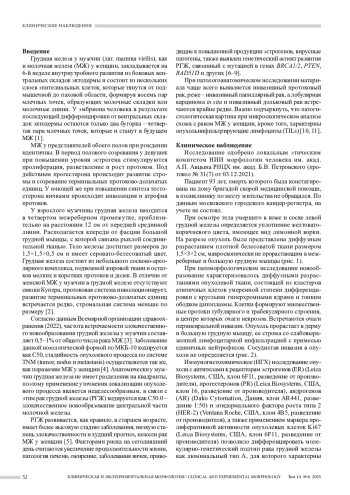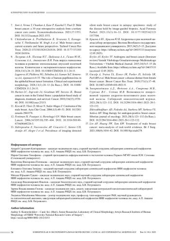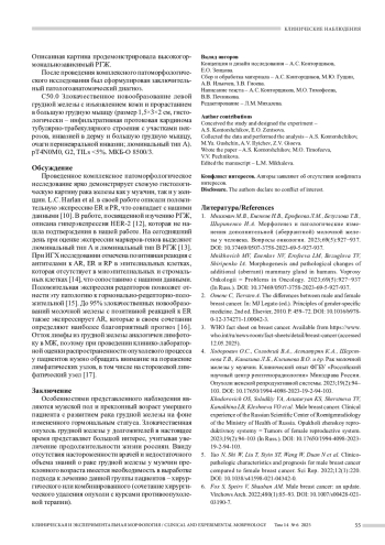 4. Ходорович О.С., Солодкий В.А., Астатурян К.А., Шерстнева Т.В., Канахина Л.Б., Клешнева В.О. и др. Рак молочной железы у мужчин. Клинический опыт ФГБУ «Российский научный центр рентгенорадиологии» Минздрава России. Опухоли женской репродуктивной системы. 2023;19(2):94-103. DOI: 10.17650/1994-4098-2023-19-2-94-103.