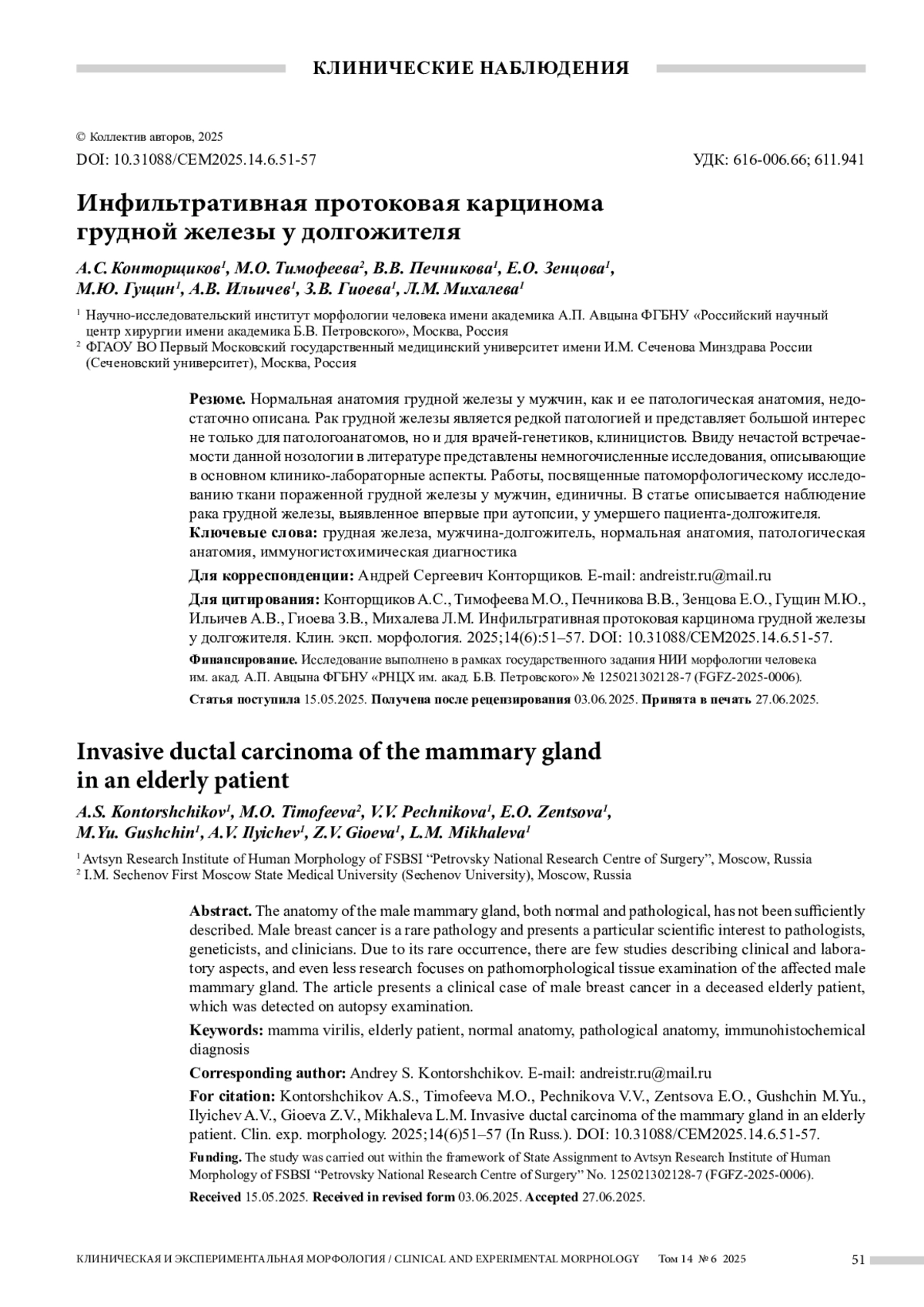 Нормальная анатомия грудной железы у мужчин, как и ее патологическая анатомия, недостаточно описана. Рак грудной железы является редкой патологией и представляет большой интерес не только для патологоанатомов, но и для врачей-генетиков, клиницистов. Ввиду нечастой встречаемости данной нозологии в литературе представлены немногочисленные исследования, описывающие в основном клинико-лабораторные аспекты. Работы, посвященные патоморфологическому исследованию ткани пораженной грудной железы у мужчин, единичны. В статье описывается наблюдение рака грудной железы, выявленное впервые при аутопсии, у умершего пациента-долгожителя.