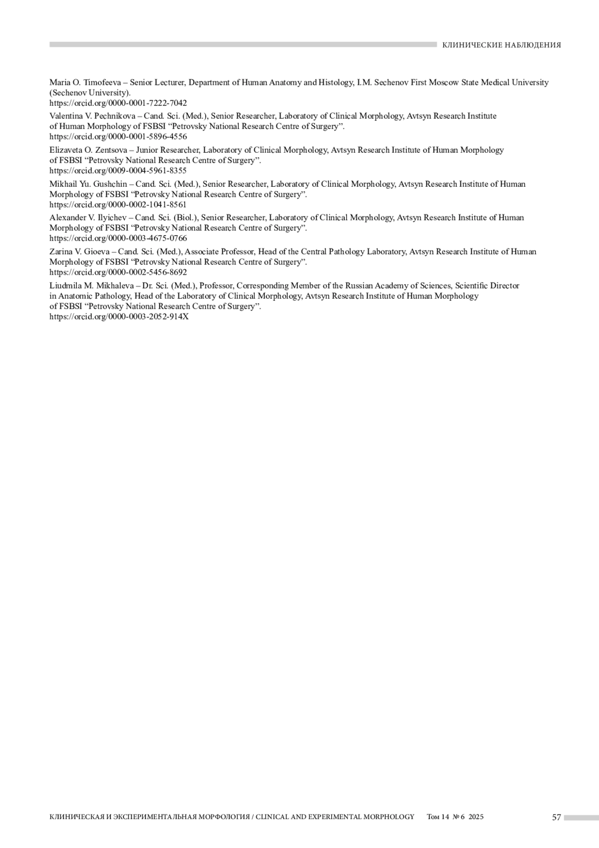 1. Мнихович М.В., Ененков Н.В., Ерофеева Л.М., Безуглова Т.В., Ширипенко И.А. Морфогенез и патологические изменения дополнительной (аберрантной) молочной железы у человека. Вопросы онкологии. 2023;69(5):927-937. DOI: 10.37469/0507-3758-2023-69-5-927-937.