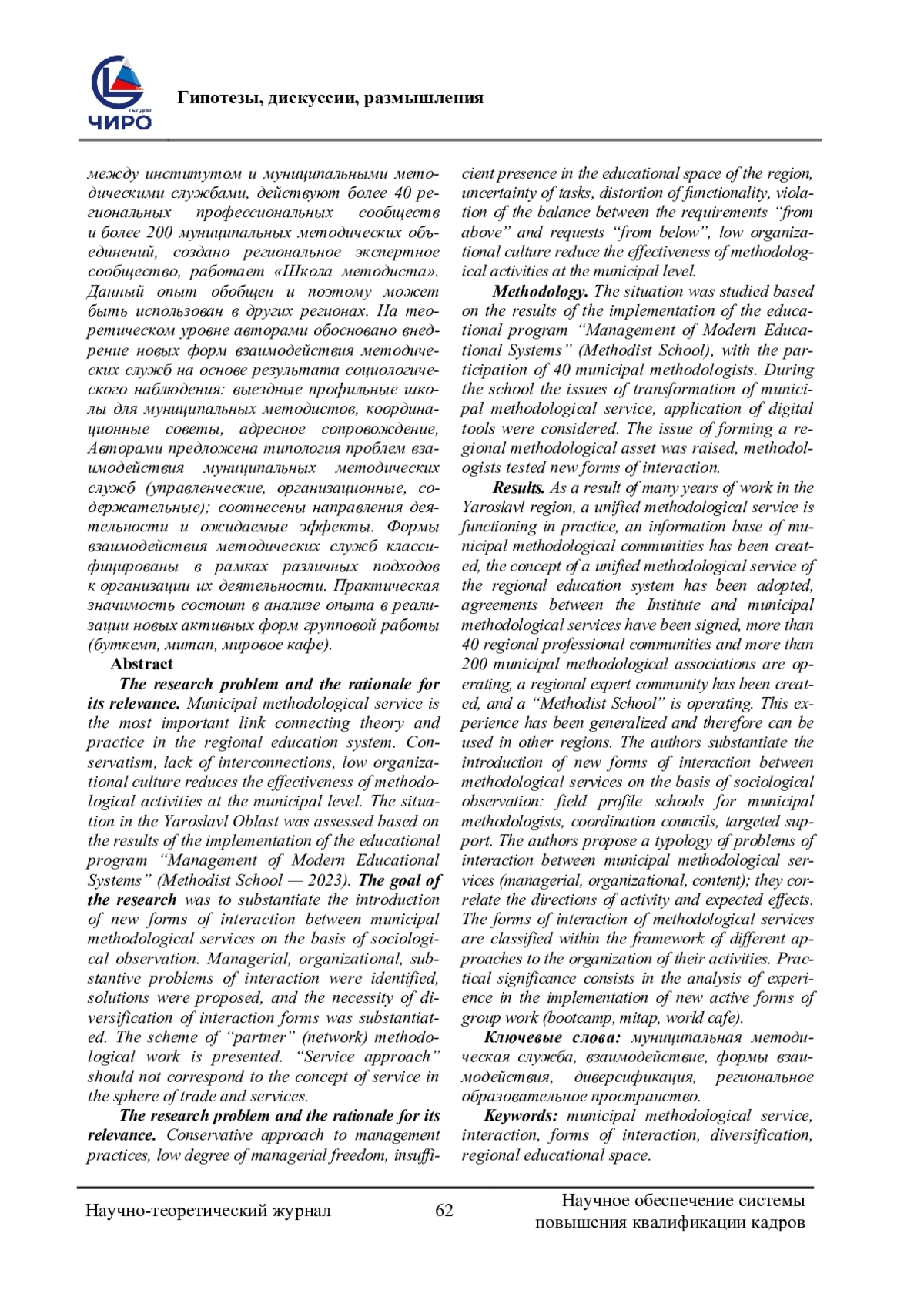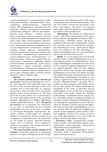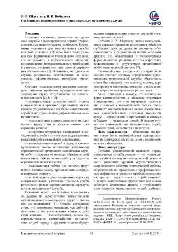 Проблема исследования, обоснование ее актуальности. Муниципальная методическая служба является важнейшим звеном, связывающим теорию и практику в региональной системе образования. Консерватизм, недостаток взаимосвязей, низкая организационная культура снижают эффективность методической деятельности на муниципальном уровне. Ситуация в Ярославской области оценивалась по итогам реализации образовательной программы «Управление современными образовательными системами» (Школа методиста - 2023). Целью исследования являлось обоснование внедрения новых форм взаимодействия муниципальных методических служб на основе социологического наблюдения. Были выделены управленческие, организационные, содержательные проблемы взаимодействия, предложены решения, обоснована необходимость диверсификации форм взаимодействия. Представлена схема «партнерской» (сетевой) методической работы. «Сервисный подход» не должен соответствовать понятию сервиса в сфере торговли и услуг. Проблема исследования и обоснование ее актуальности. Консервативный подход к практике управления, низкая степень управленческой свободы, недостаточная степень присутствия в образовательном пространстве региона, неопределенность задач, искажение функционала, нарушение баланса между требованиями «сверху» и запросами «снизу», низкая организационная культура снижают эффективность методической деятельности на муниципальном уровне. Методология (материалы и методы). Ситуация изучалась по итогам реализации образовательной программы «Управление современными образовательными системами» (Школа методиста), с участием 40 муниципальных методистов. В ходе школы рассматривались вопросы трансформации муниципальной методической службы, применение цифровых инструментов. Был поднят вопрос формирования регионального методического актива, методисты апробировали новые форма взаимодействия. Результаты. В результате многолетней работы в Ярославской области на практике функционирует единая методическая служба, создана информационная база муниципальных методических сообществ, принята концепция единой методической службы региональной системы образования, подписаны соглашения между институтом и муниципальными методическими службами, действуют более 40 региональных профессиональных сообществ и более 200 муниципальных методических объединений, создано региональное экспертное сообщество, работает «Школа методиста». Данный опыт обобщен и поэтому может быть использован в других регионах. На теоретическом уровне авторами обосновано внедрение новых форм взаимодействия методических служб на основе результата социологического наблюдения: выездные профильные школы для муниципальных методистов, координационные советы, адресное сопровождение, Авторами предложена типология проблем взаимодействия муниципальных методических служб (управленческие, организационные, содержательные); соотнесены направления деятельности и ожидаемые эффекты. Формы взаимодействия методических служб классифицированы в рамках различных подходов к организации их деятельности. Практическая значимость состоит в анализе опыта в реализации новых активных форм групповой работы (буткемп, митап, мировое кафе).
