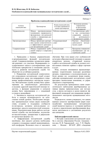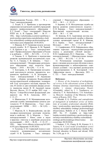 2. Ходаб, Е. Г. Проблемы и противоречия управления методической службой учреждений среднего профессионального образования / Е. Г. Ходаб. - Текст: электронный // Известия РГПУ им. А. И. Герцена. 2007. - № 37. - URL: https://cyberleninka.ru/article/n/problemy-i-protivorechiya-upravleniya-metodicheskoy-sluzh boy-uchrezhdeniy-srednego-professionalnogo-ob razovaniya (дата обращения: 28.08.2023). EDN: KVQUMF