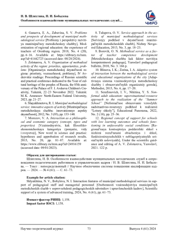 6. Шаяхметова, Р. И. Муниципальная методическая служба: инновационные аспекты деятельности / Р. И. Шаяхметова. - Текст: непосредственный // КПЖ. - 2012. - № 3 (93). - С. 133-140. EDN: PZNAQZ