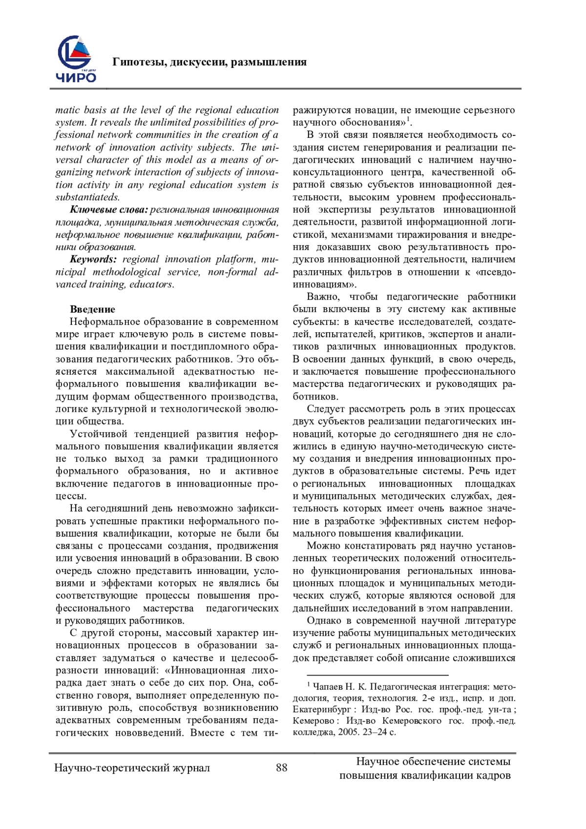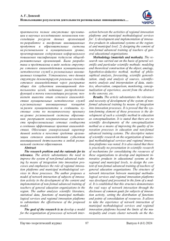 Проблема исследования и обоснование ее актуальности. В статье обосновывается необходимость совершенствования системы неформального повышения квалификации средствами интеграции в инновационные процессы и подчеркивается роль в этих процессах региональных инновационных площадок и муниципальных методических служб. Автором предлагается модель сетевого взаимодействие субъектов инновационной деятельности в разработке содержания и реализации неформального повышения квалификации педагогов общеобразовательных организаций региона. Для обоснования эффективности предлагаемой модели автор проводит анализ научной литературы, статистических данных, функций муниципальных методических служб и региональных инновационных площадок. Цель исследования - разработка модели организации процессов сетевого взаимодействия деятельности региональных инновационных площадок и муниципальных методических служб по: 1) разработке и внедрению инновационных продуктов в образовательные системы на региональном и муниципальном уровне; 2) проектированию содержания неформального повышения квалификации педагогов общеобразовательных организаций. Методология (материалы и методы). Исследование проведено на основе общенаучных и частнонаучных методов: моделирования и теоретического конструирования объекта, аналогии, гипотетико-дедуктивного метода, метода философского анализа, прогнозирования, научного обобщения, изучения и анализа источников, наукометрического анализа и интерпретации данных, статистики, наблюдения, сравнения, мониторинга, концептуализации опыта, восхождения от абстрактного к конкретному и т. д. Результаты. Обоснована актуальность и необходимость развития системы неформального повышения квалификации средствами интеграции в инновационные процессы. Доказано, что системообразующим элементом данных процессов является разработка такого научного метода в образовании как концептуализация. Констатировано отсутствие научных разработок метода концептуализации как средства повышения качества инновационных процессов в образовании и систем неформального повышения квалификации. Отмечен описательный характер научных исследований по вопросам организации деятельности муниципальных методических служб и региональных инновационных площадок. Также констатировано практически полное отсутствие презентации в научных исследованиях механизмов консолидации ресурсов данных организаций по разработке и внедрению инновационных продуктов в образовательные системы на региональном и муниципальном уровне, проектированию содержания неформального повышения квалификации педагогов общеобразовательных организаций. Была разработана и представлена в виде модели структура сетевого взаимодействия муниципальных методических служб и региональных инновационных площадок. Установлено, что данная структура демонстрирует реальные способы сетевого взаимодействия через раскрытие общих для субъектов инновационной деятельности целей, задающих распределение функций и точки консолидации ресурсов; позволяет вывести опыт сетевого взаимодействия муниципальных методических служб и региональных инновационных площадок за рамки муниципалитета и создавать кустовые сети по тематическому признаку на уровне региональной системы об