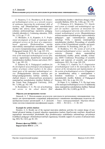 19. Тетина, С. В. Организация методической работы в муниципалитете в контексте внедрения и реализации системы методических служб / С. В. Тетина, Ю. В. Гутрова. - Текст: непосредственный // Вестник педагогических наук. - 2021. - № 6. - С. 224-229. EDN: GFEKZO