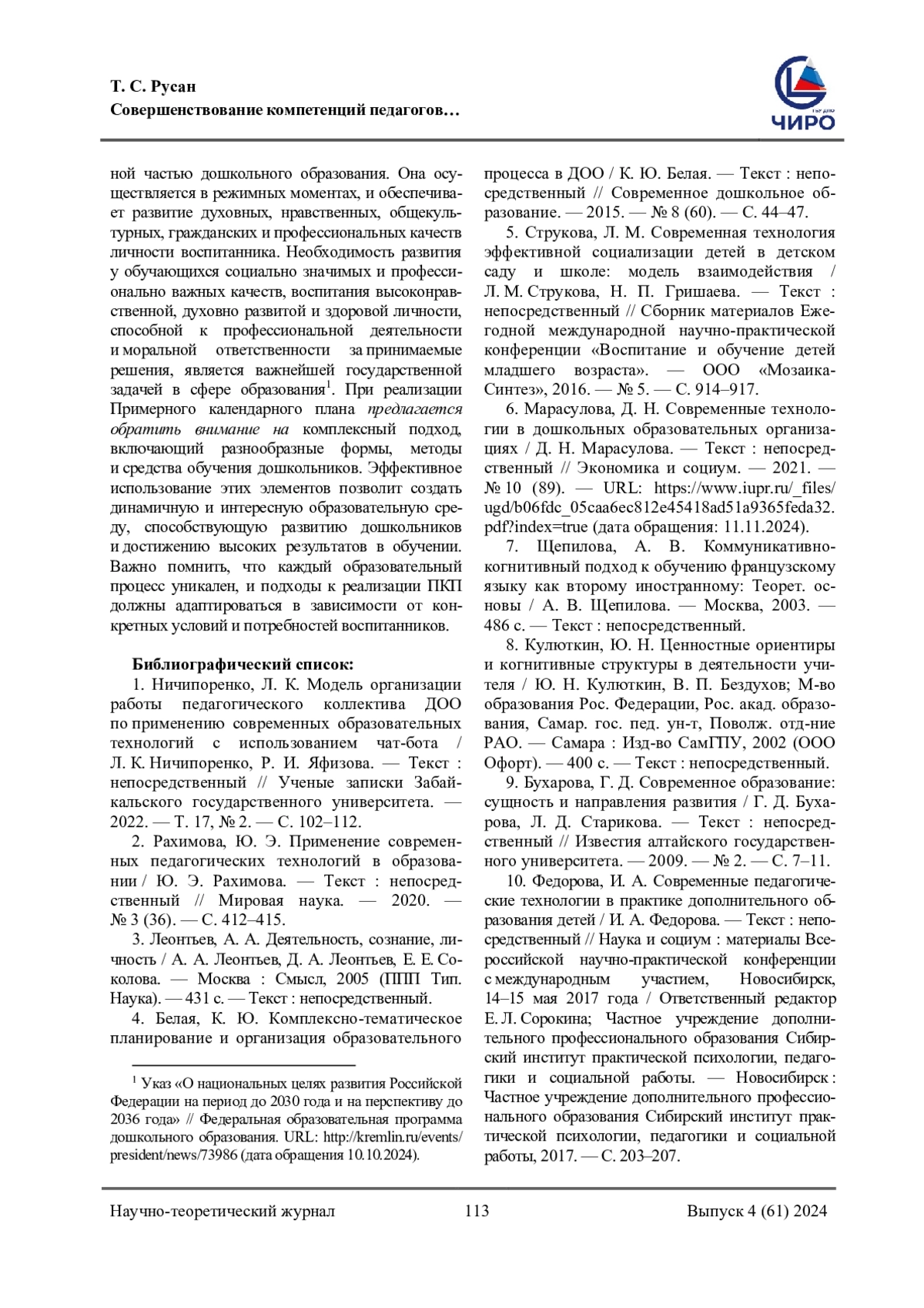 1. Ничипоренко, Л. К. Модель организации работы педагогического коллектива ДОО по применению современных образовательных технологий с использованием чат-бота / Л. К. Ничипоренко, Р. И. Яфизова. - Текст: непосредственный // Ученые записки Забайкальского государственного университета. - 2022. - Т. 17, № 2. - С. 102-112. EDN: RATWSE