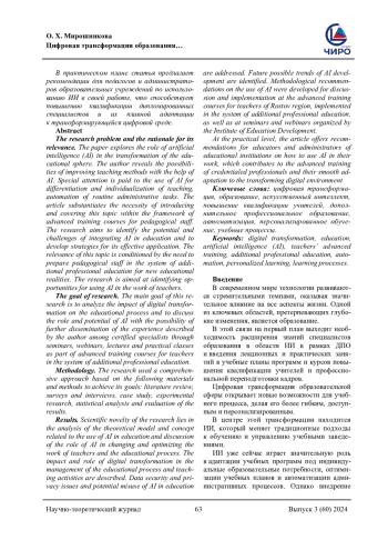 Проблема исследования, обоснование ее актуальности. В работе исследуется роль искусственного интеллекта (ИИ) в трансформации образовательной сферы. Автор раскрывает возможности совершенствования методов преподавания с помощью ИИ. Особое внимание уделяется использованию ИИ для дифференциации и индивидуализации обучения, автоматизации рутинных административных задач. Статья обосновывает необходимость внедрения и освещения данной темы в рамках курсов повышения квалификации педагогических кадров. Исследование направлено на выявление потенциала и проблем, связанных с интеграцией ИИ в образование, и разработку стратегий для его эффективного применения. Актуальность данной темы обусловлена необходимостью подготовки педагогических кадров в системе ДПО к новым образовательным реалиям. Исследование направлено на выявление возможностей использования ИИ в работе педагога. Цель исследования. Основной целью данного исследования является анализ влияния цифровой трансформации на образовательный процесс и обсуждение роли и потенциала ИИ с возможностью дальнейшей диссеминации описанного автором опыта среди дипломированных специалистов через семинары, вебинары, лекции и практические занятия в рамках курсов повышения квалификации учителей в системе ДПО. Методология исследования (материалы и методы) Для достижения поставленных целей исследования использовался комплексный подход, основанный на следующих материалах и методах: литературный обзор, опросы и интервью, анализ случаев (case study), экспериментальное исследование, статистический анализ и оценка полученных результатов. Результаты Научная новизна исследования заключается в анализе теоретической модели и концепции, связанной с использованием ИИ в образовании и обсуждении роли ИИ в изменении и оптимизации работы педагогов и образовательного процесса в целом. Описано влияние и роль цифровой трансформации в управлении образовательным процессом и преподавательской деятельностью. Рассмотрены вопросы безопасности и конфиденциальности данных и потенциальное неправомерное использование ИИ в образовании. Определены будущие возможные тенденции развития ИИ. Разработаны методические рекомендации по использованию ИИ для обсуждения и внедрения на курсах повышения квалификации учителей Ростовской области, реализуемых в системе ДПО, а также на семинарах и вебинарах, организуемых Институтом развития образования (ГАУ ДПО РО ИРО). В практическом плане статья предлагает рекомендации для педагогов и администраторов образовательных учреждений по использованию ИИ в своей работе, что способствует повышению квалификации дипломированных специалистов и их плавной адаптации к трансформирующейся цифровой среде.