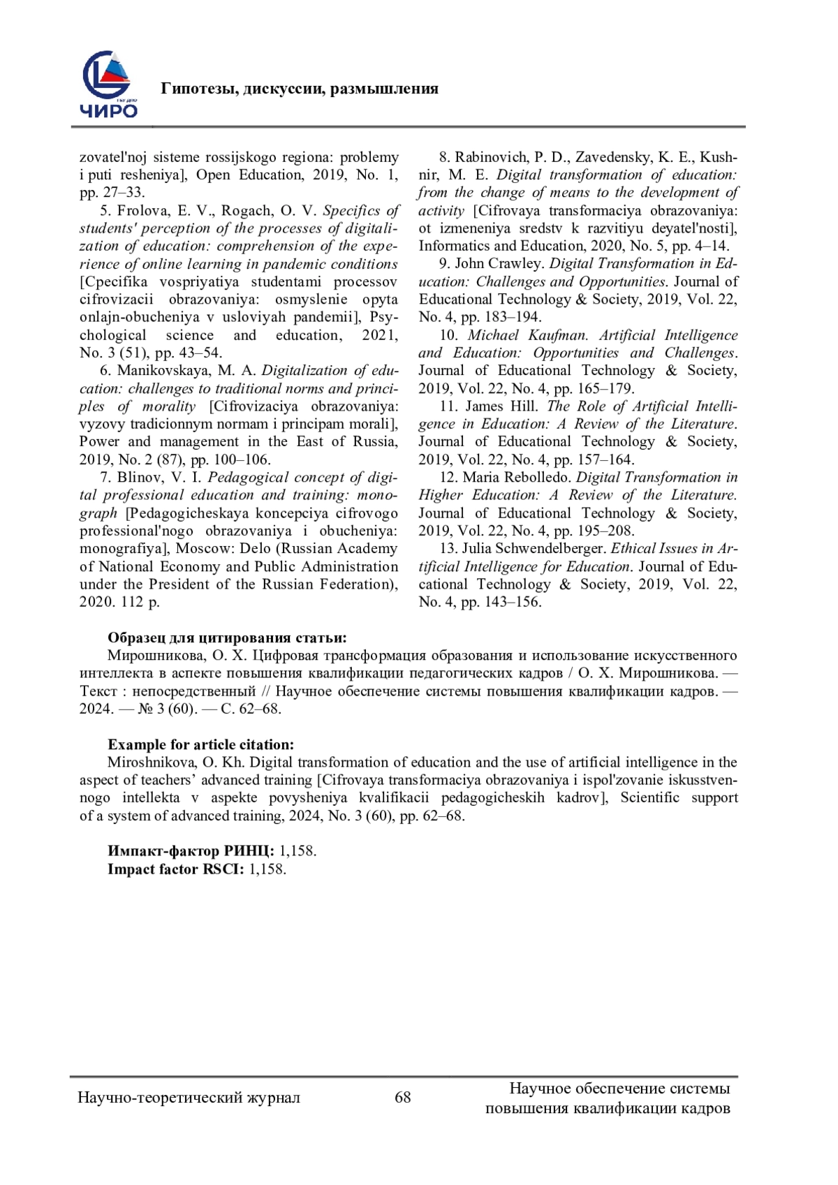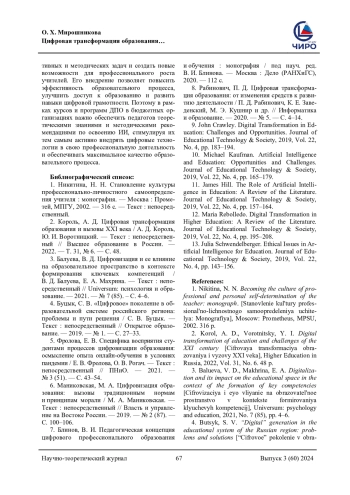 2. Король, А. Д. Цифровая трансформация образования и вызовы XXI века / А. Д. Король, Ю. И. Воротницкий. - Текст: непосредственный // Высшее образование в России. - 2022. - Т. 31, № 6. - С. 48. EDN: SXEPBK