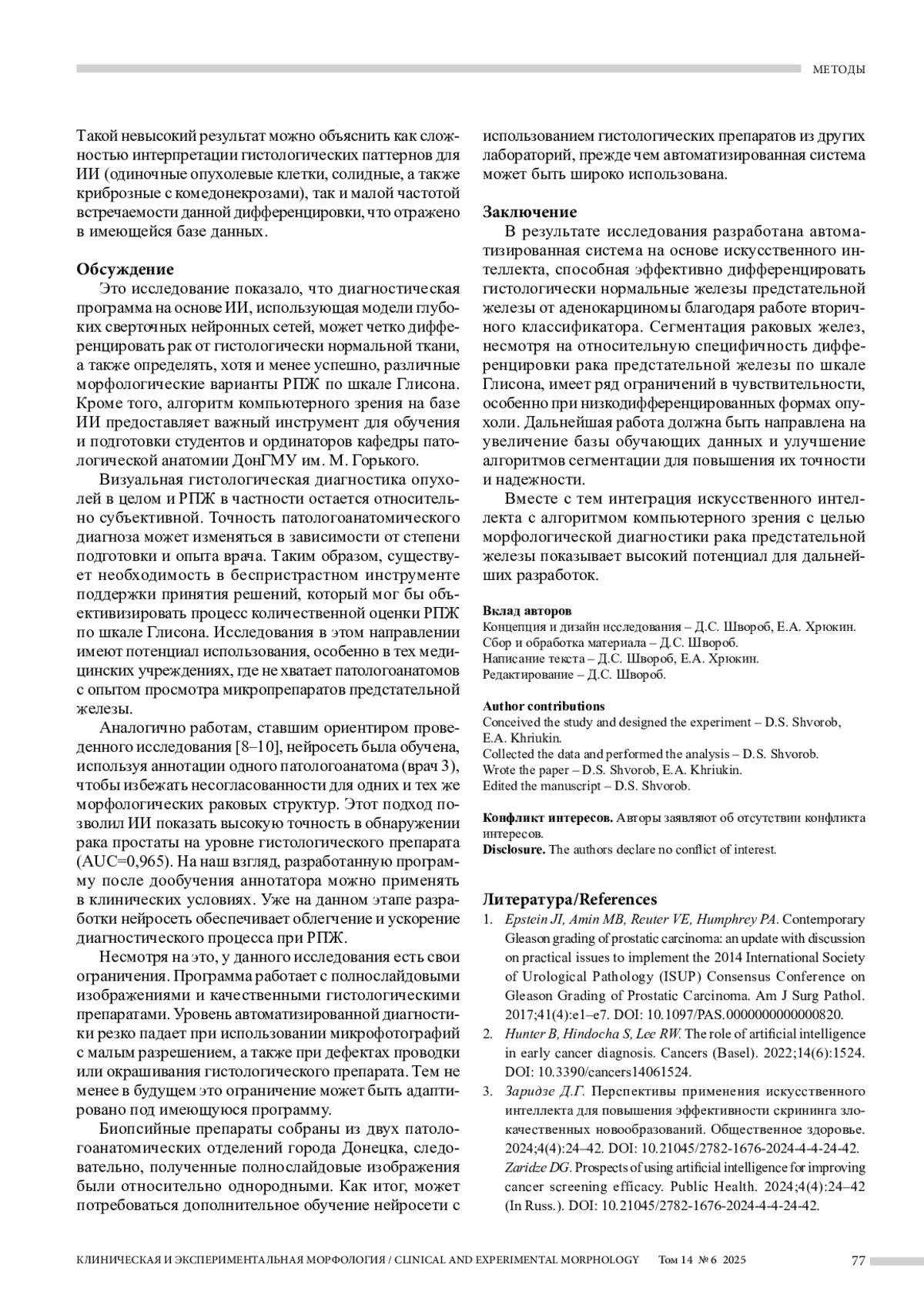 5. Волкова Л.В., Батищев А.В., Михалева Л.М. Исследование патологии желудка с использованием методов искусственного интеллекта для анализа данных микроскопии. Клиническая и экспериментальная морфология. 2024;13(3):5-15. DOI: 10.31088/CEM2024.13.3.5-15.
