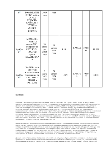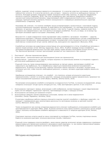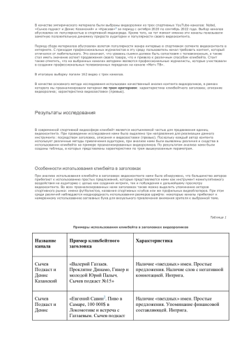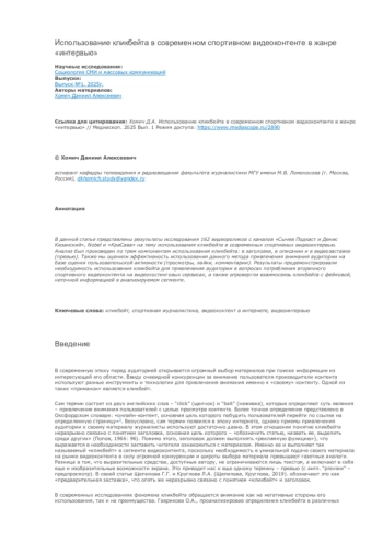 В данной статье представлены результаты исследования 162 видеороликов с каналов «Сычев Подкаст и Денис Казанский», Nobel и «КраСава» на тему использования кликбейта в современных спортивных видеоинтервью. Анализ был произведен по трем компонентам использования кликбейта: в заголовке, в описании и в видеозаставке (превью). Также мы оценили эффективность использования данного метода привлечения внимания аудитории на базе оценки пользовательской активности (просмотры, лайки, комментарии). Результаты продемонстрировали необходимость использования кликбейта для привлечения аудитории в вопросах потребления вторичного спортивного видеоконтента на видеохостинговых сервисах, а также опровергли взаимосвязь кликбейта с фейковой, неточной информацией в анализируемом сегменте.