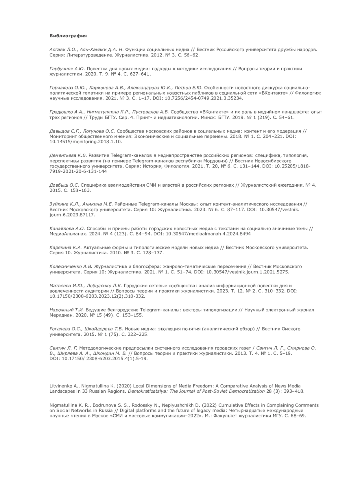 17. Litvinenko A., Nigmatullina K. (2020) Local Dimensions of Media Freedom: A Comparative Analysis of News Media Landscapes in 33 Russian Regions. Demokratizatsiya: The Journal of Post-Soviet Democratization 28 (3): 393-418.