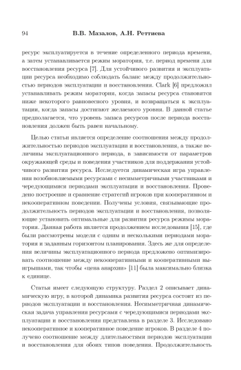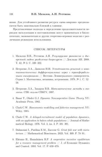 1. Мазалов В.В., Реттиева А.Н. Регулируемое равновесие в дискретной задаче разделения биоресурсов // Доклады АН. 2008. Т. 42, № 3. C. 320-322.