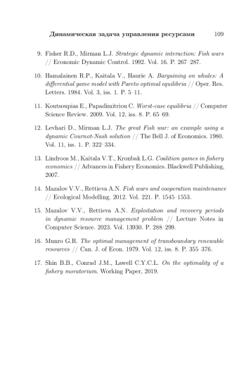 14. Mazalov V.V., Rettieva A.N. Fish wars and cooperation maintenance // Ecological Modelling. 2012. Vol. 221. P. 1545-1553.