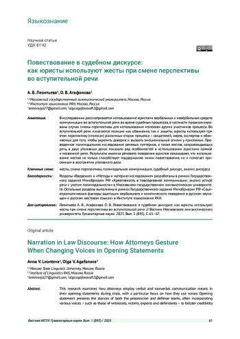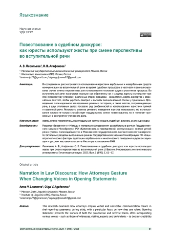 В исследовании рассматривается использование юристами вербальных и невербальных средств коммуникации во вступительной речи во время судебных процессов, в частности проанализированы случаи смены перспективы для использования «голосов» других участников процесса. Во вступительной речи излагаются позиции как обвинения, так и защиты, юристы используют при этом перспективу («голоса») различных сторон процесса - свидетелей, жертв, экспертов и обвиняемых для того, чтобы укрепить доверие и вызвать эмоциональный отклик у присяжных. Проведенное полимодальное исследование речевых паттернов, а также жестов, сопровождающих речь, в двух уголовных делах показало ряд особенностей в использовании юристами прямой и косвенной речи. Результаты анализа речевого поведения юристов показывают, что использование жестов не только способствует поддержанию линии повествования, но и помогает присяжным в восприятии уголовного дела.