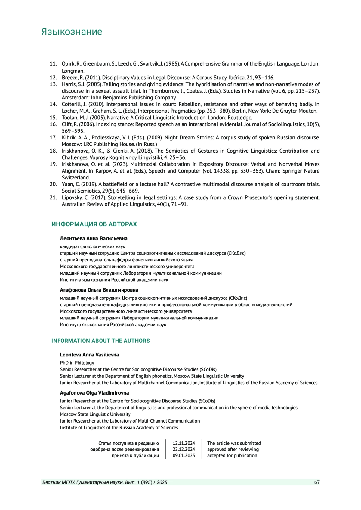 21. Lipovsky C. Storytelling in legal settings: A case study from a Crown Prosecutor’s opening statement // Australian Review of Applied Linguistics. 2017. Vol. 40. № 1. P. 71-91.