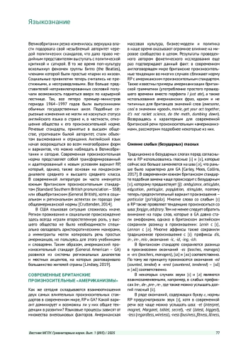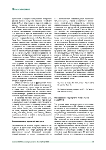 9. Безбородова М. В., Медведева Т. В. Явление “uptalk” в речи молодых носителей британского варианта английского языка // Вестник Московского государственного лингвистического университета. Гуманитарные науки. 2018. Вып. 10 (803). С. 21-35. EDN: PEMIBM