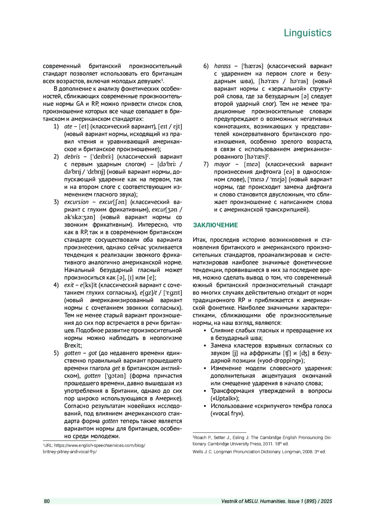 Целью настоящего исследования является сопоставление фонетических признаков современного британского и американского произносительных стандартов и выявление их общих характеристик, свидетельствующих о наличии схожих тенденций в их развитии. Методом аудиторского анализа в речи молодых британцев и американцев были выявлены сегментные и супрасегментные особенности. Они были сопоставлены с данными предыдущих исследователей и проанализированы на предмет взаимного сходства или различия. Результаты проведенного эксперимента доказали наличие общих тенденций в исследуемых произносительных стандартах как на уровне реализации отдельных звуков и словесного ударения, так и в ритмических, тембральных и мелодических характеристиках.