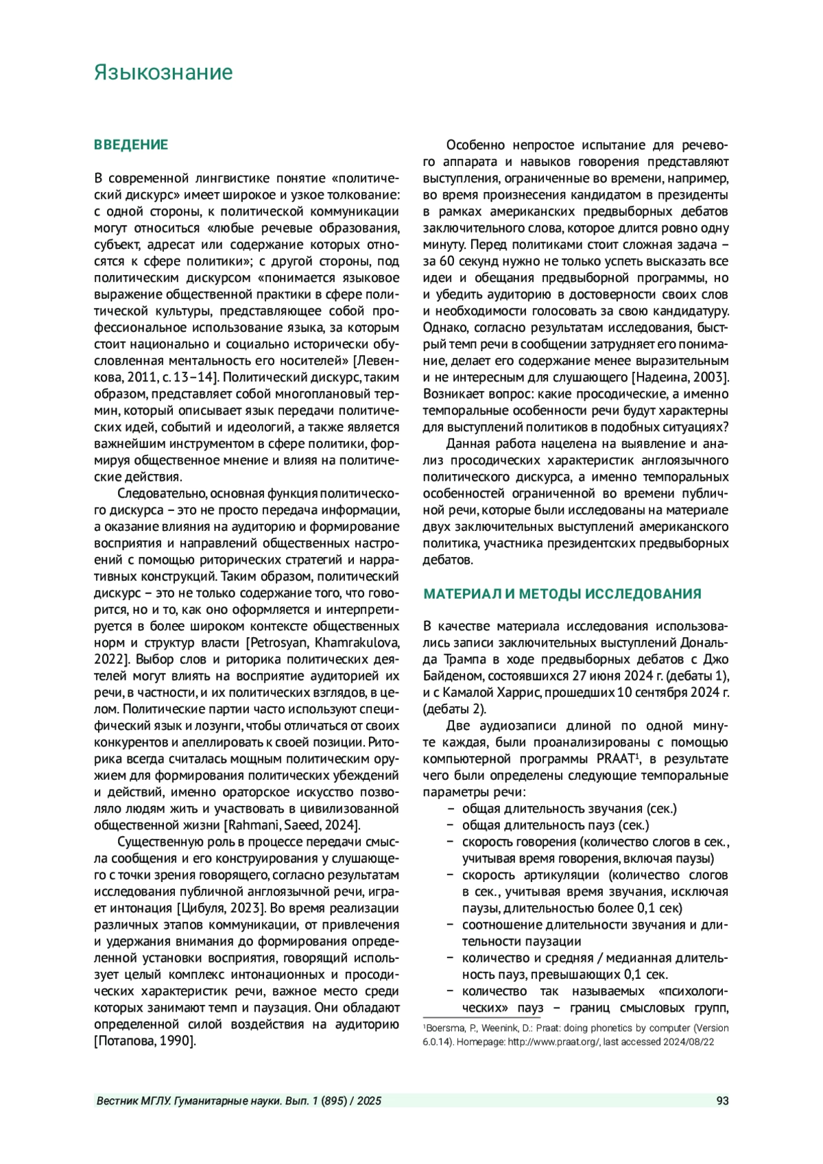 Цель настоящего исследования заключается в описании просодических особенностей англоязычного политического дискурса, а именно темпоральных характеристик речи американского политика в ходе предвыборных дебатов с главным оппонентом. В качестве материала исследования использованы заключительные выступления кандидата в президенты США Дональда Трампа в рамках двух состоявшихся в этом году президентских дебатов. Результаты слухового, электронно-акустического и статистического анализов выявили специфику темпорального оформления речи участника англоязычного политического дискурса в условиях временных ограничений.