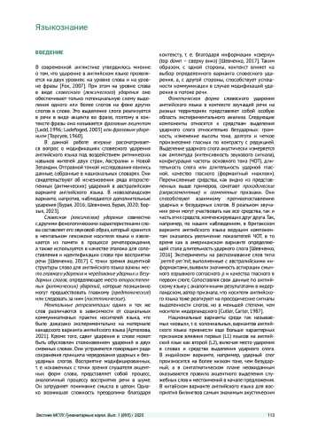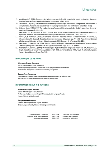 12. Шевченко Т. И., Романова Е. Ю. Английское лексическое ударение в нормообразующих, норморазвивающих и нормозависимых странах // Вестник Московского государственного лингвистического университета. Гуманитарные науки. 2022. Вып. 1 (856). С. 137-142. EDN: EKLLDU