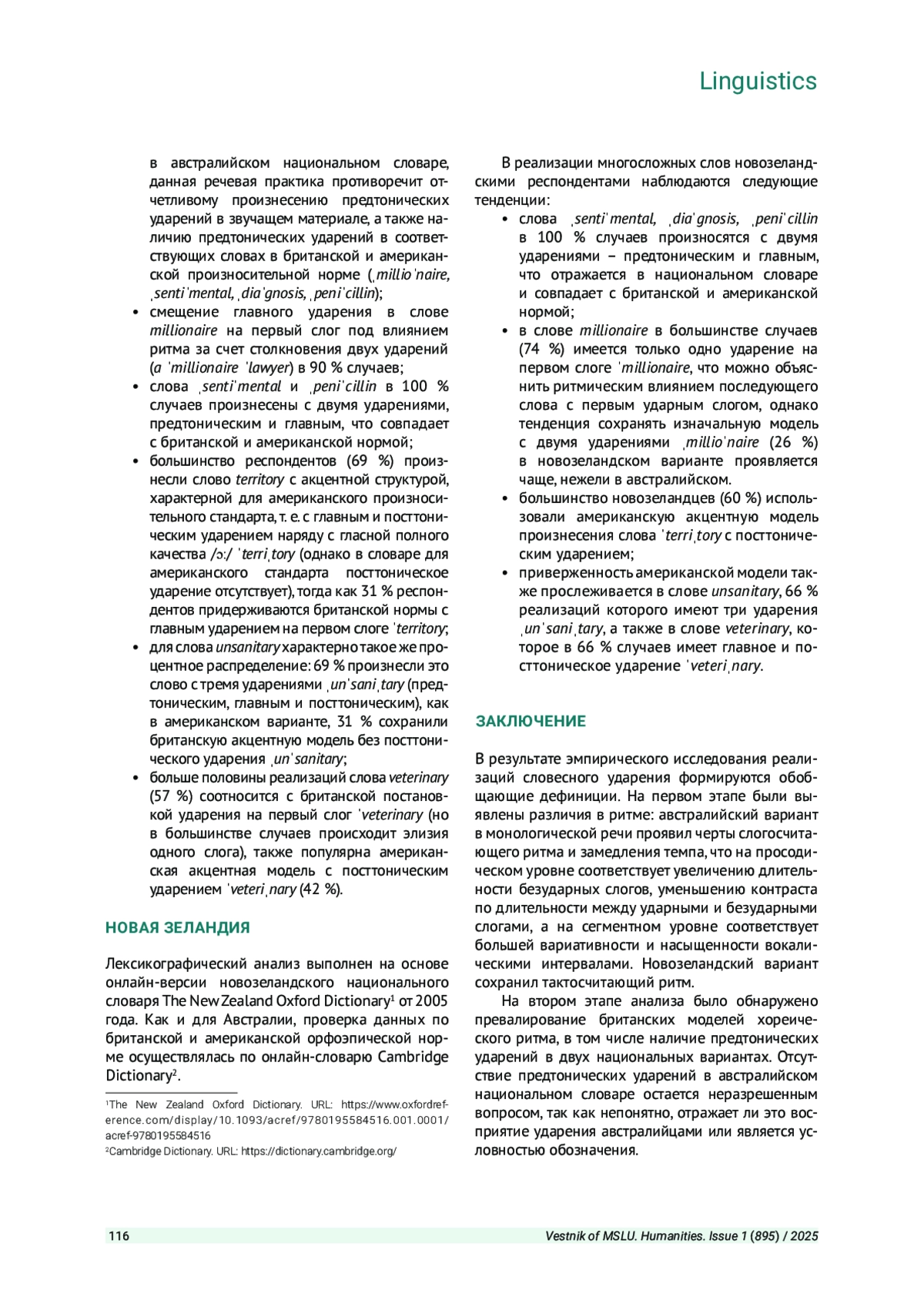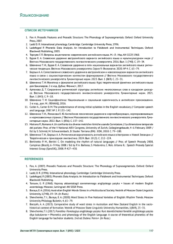 7. Борзых А. А. Сопоставление словесного ударения в австралийском и новозеландском вариантах английского языка в связи с социоисторическим контекстом формирования // Вестник Московского государственного лингвистического университета. Гуманитарные науки. 2023. Вып. 1 (869). С. 25-31. EDN: FUDUOF