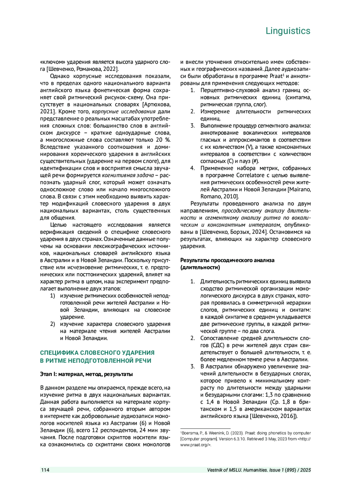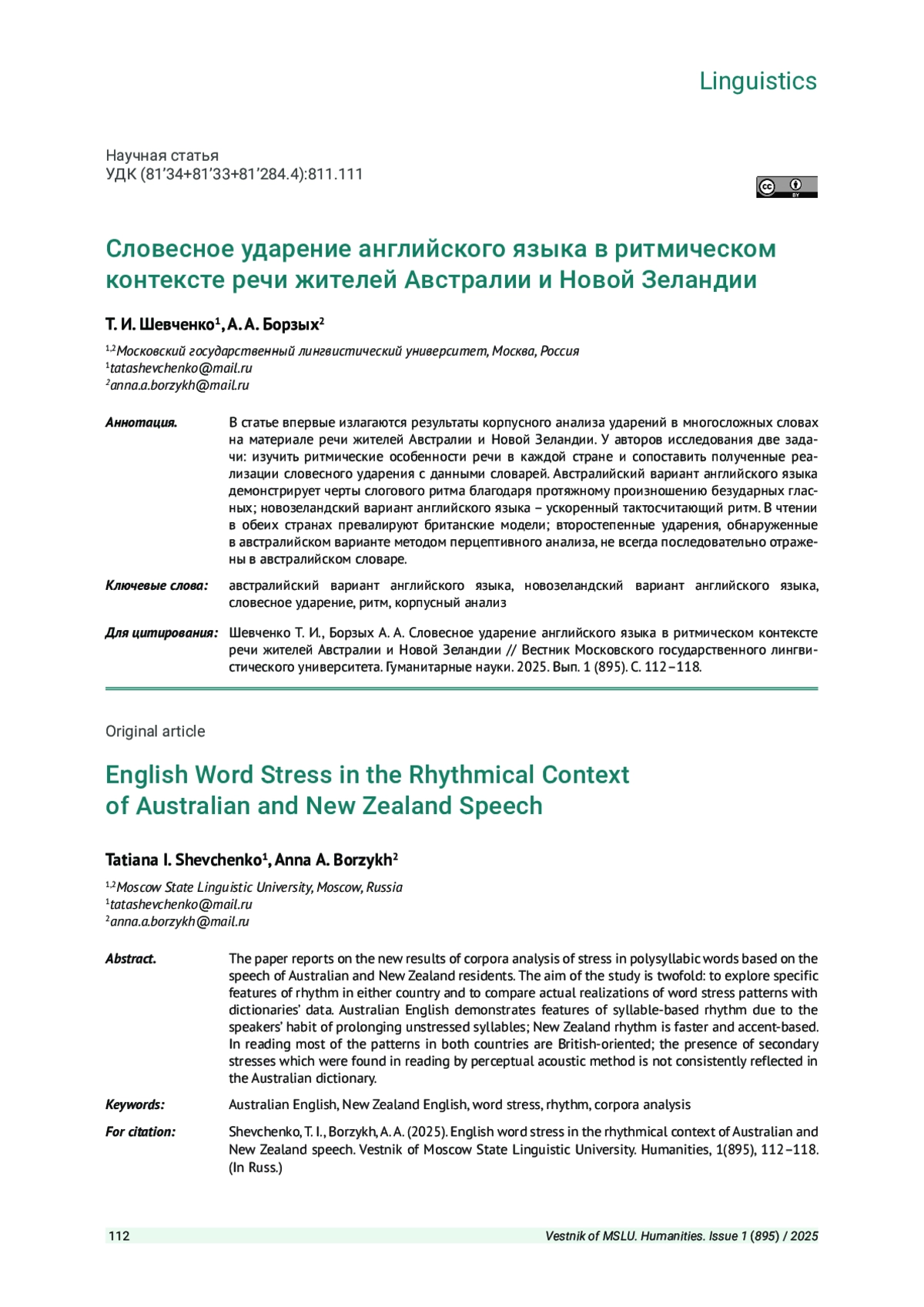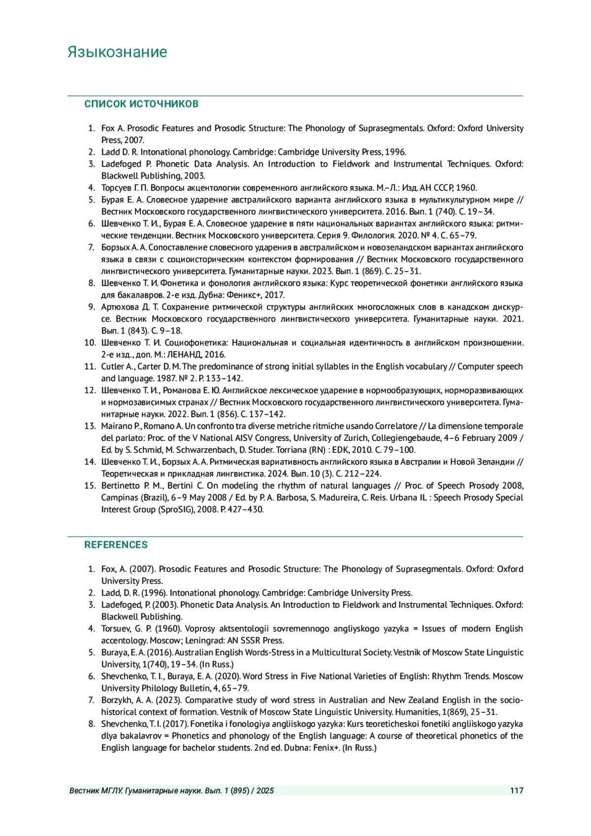 14. Шевченко Т. И., Борзых А. А. Ритмическая вариативность английского языка в Австралии и Новой Зеландии // Теоретическая и прикладная лингвистика. 2024. Вып. 10 (3). С. 212-224. EDN: GPQBJA