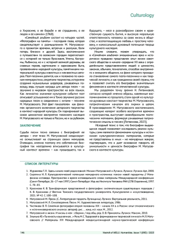 8. Злынько Ю. “Ты юность наша вечная…” Роль М. С. Тодоровой в формировании творческой личности М. Л. Матусовского // Материалы ХVI Международной междисциплинарной научно-практической конференции “Матусовские чтения” (26 апреля 2023 года). Луганск: Изд-во Луганcкая государственная академии культуры и искусств имени Михаила Матусовского, 2023. С. 11-14.
