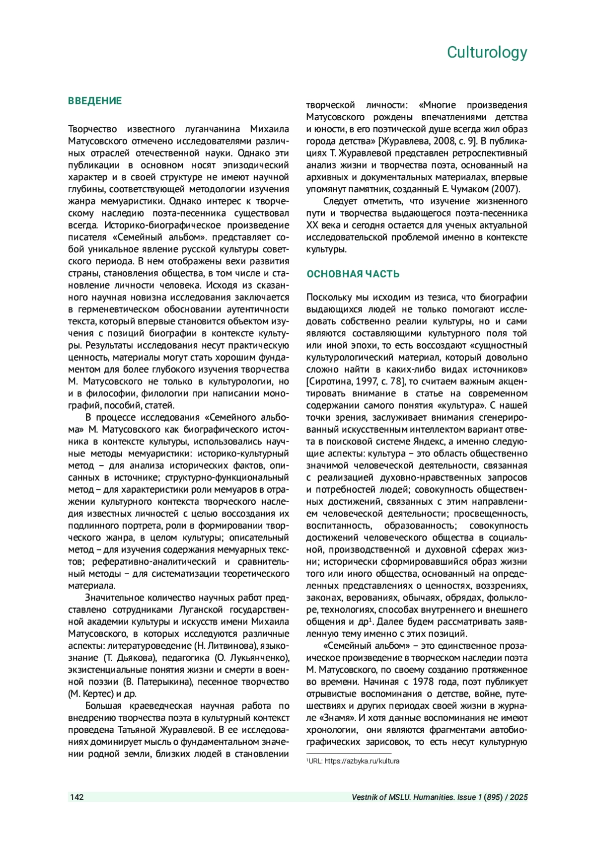 Творчество известного луганчанина Михаила Мату совского отмечено исследователями различных отраслей отечественной науки. Однако эти публикации в основном носят эпизодический характер и в своей структуре не имеют научной глубины, соответствующей методологии изучения жанра мемуаристики.