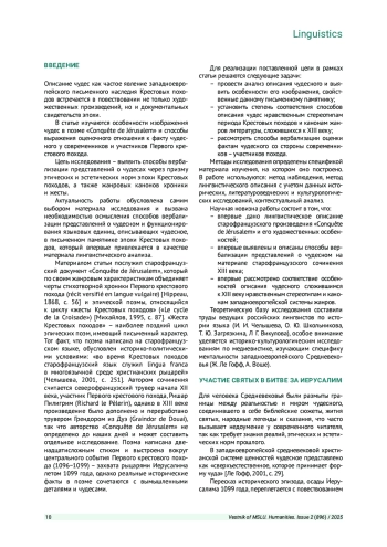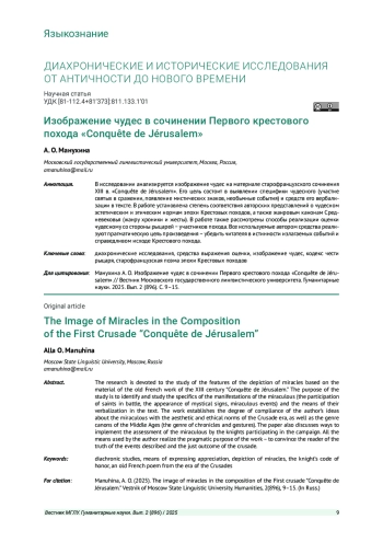 В исследовании анализируется изображение чудес на материале старофранцузского сочинения XIII в. «Conquête de Jérusalem». Его цель состоит в выявлении специфики чудесного (участие святых в сражении, появление мистических знаков, необычные события) и средств его вербализации в тексте. В работе установлена степень соответствия авторских представлений о чудесном эстетическим и этическим нормам эпохи Крестовых походов, а также жанровым канонам Средневековья (жанру хроники и жесты). В работе также рассмотрены способы реализации оценки чудесному со стороны рыцарей - участников похода. Все используемые автором средства реализуют прагматическую цель произведения - убедить читателя в истинности излагаемых событий и справедливом исходе Крестового похода.