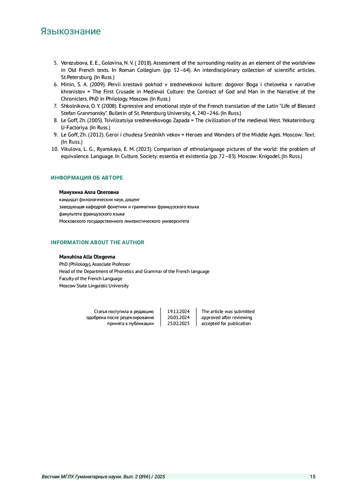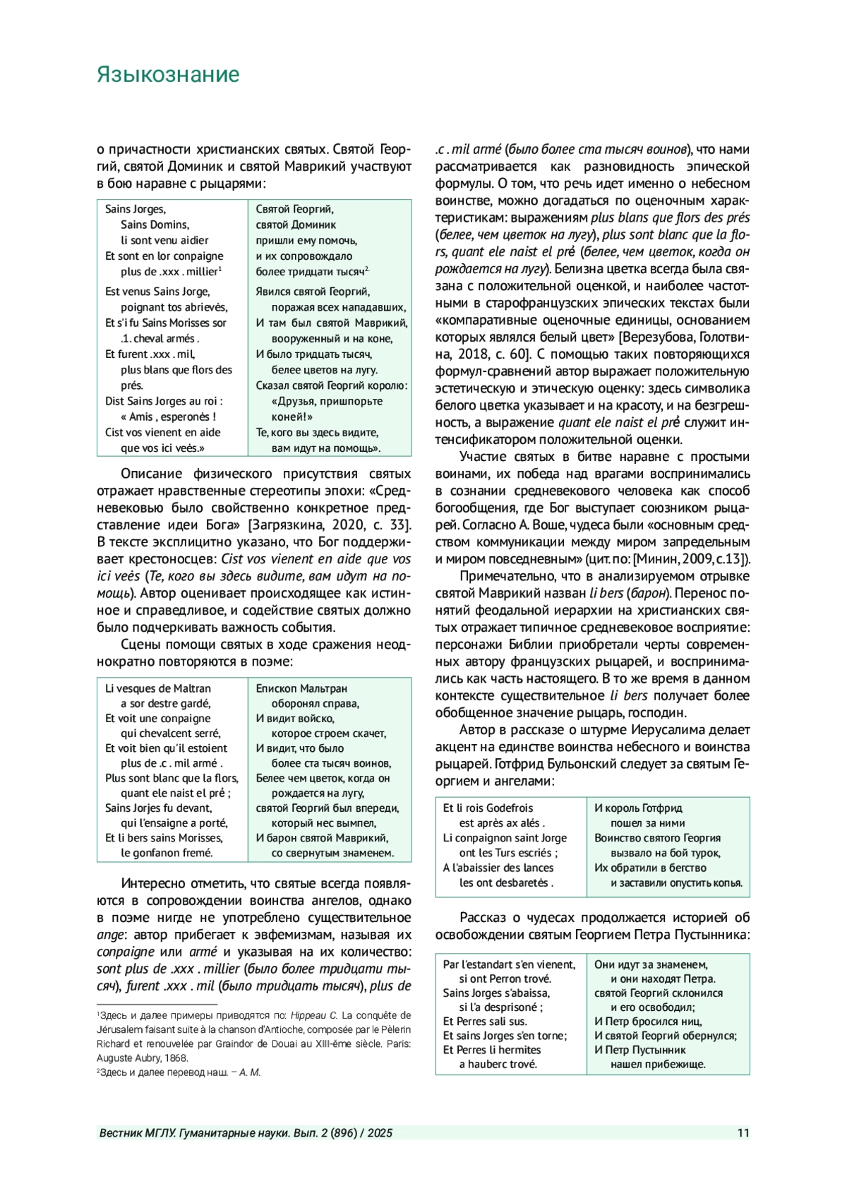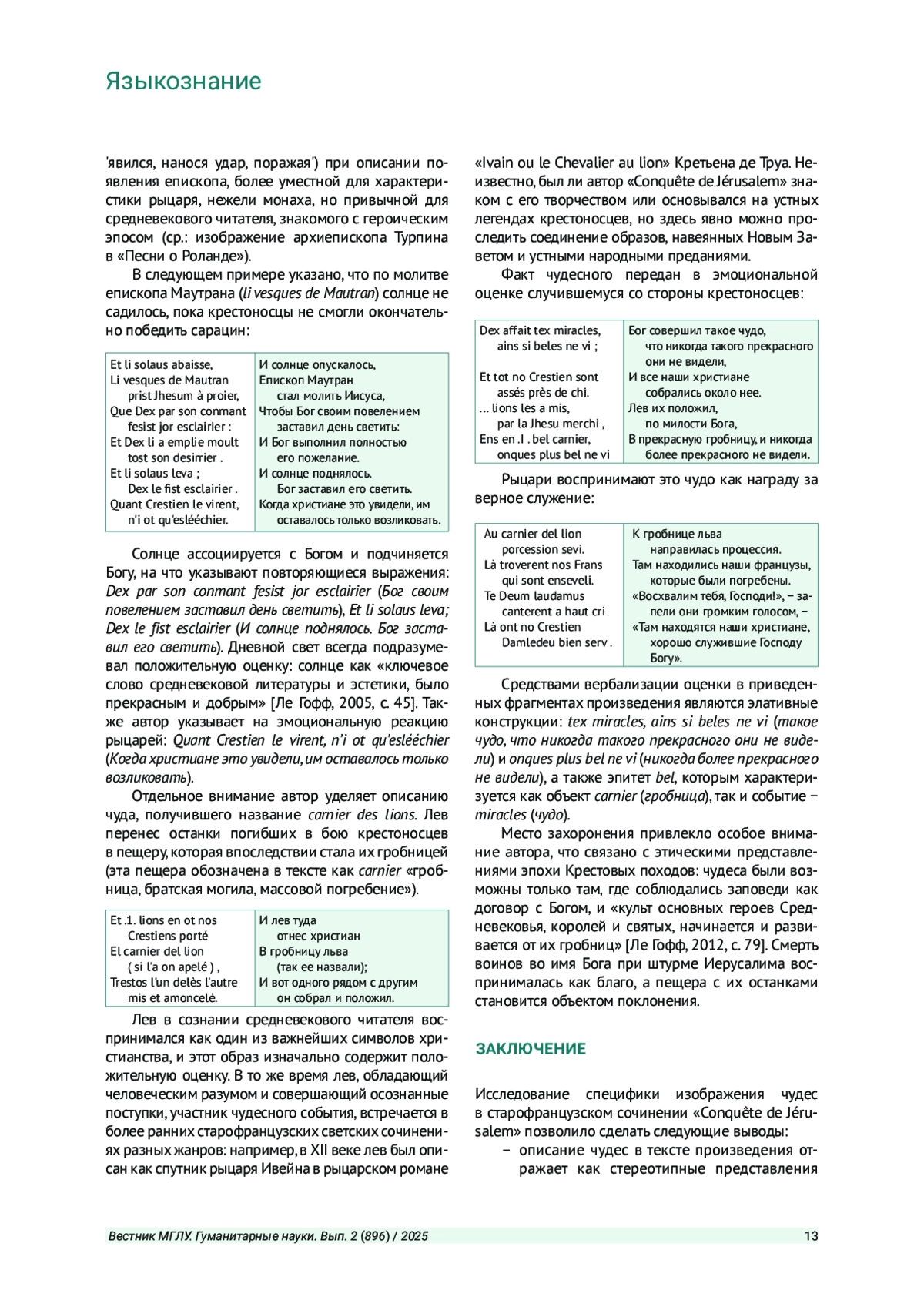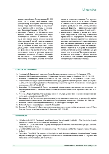 5. Верезубова Е. Е., Голотвина Н. В. Оценка окружающей действительности как элемент картины мира в старофранцузских текстах // Романский коллегиум: междисциплинарный сборник научных статей. СПб., 2018. С. 52-64. EDN: YUAVSP