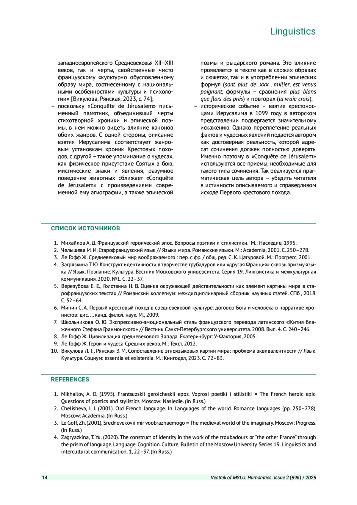 4. Загрязкина Т Ю. Конструкт идентичности в творчестве трубадуров или “другая Франция” сквозь призму языка // Язык. Познание. Культура. Вестник Московского университета. Серия 19. Лингвистика и межкультурная коммуникация. 2020. №1. С. 22-37.