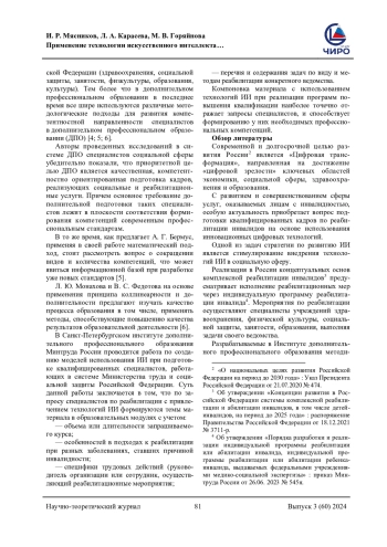 Проблема исследования и обоснование ее актуальности. В России с 2022 г. реализуется «Концепция развития системы комплексной реабилитации инвалидов…», согласно которой мероприятия по реабилитации инвалидов осуществляются специалистами учреждений различных ведомств субъектов Российской Федерации: здравоохранения, социальной защиты, занятости, физкультуры, образования. Поэтому подготовка таких специалистов, владеющих профессиональными компетенциями по комплексной реабилитации инвалидов, является приоритетной задачей социальной политики. В работе показан опыт применения технологии искусственного интеллекта в дополнительном профессиональном образовании специалистов учреждений различных ведомств субъектов Российской Федерации. Цель - разработать алгоритм использования технологии искусственного интеллекта в дополнительном профессиональном образовании специалистов по реабилитации инвалидов. Материалы и методы. Были изучены нормативно-правовые документы: федеральные законы, распоряжения и постановления Правительства Российской Федерации, профессиональные стандарты специалистов, предоставляющих услуги по реабилитации инвалидов. Составлена оригинальная анкета социологического опроса для 47 специалистов, участвующих в обучении с использованием технологии искусственного интеллекта. Использованы методы анкетирования, анализа, программирования, обобщения. Результаты. Разработан алгоритм использования технологии искусственного интеллекта при обучении специалистов, оказывающих реабилитационные услуги. Определены ключевые слова для формирования запроса нейросети и составления персональных модулей в образовательных программах. Впервые в системе дополнительного профессионального образования по комплексной реабилитации инвалидов осуществлено обучение специалистов различных ведомств с привлечением нейросети. Применение технологии искусственного интеллекта оптимизирует процесс подготовки специалистов по комплексной реабилитации инвалидов с учетом специфики их практической деятельности.