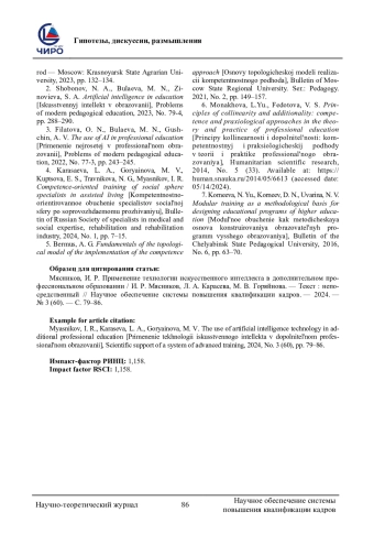 1. Сябитова, К. С. Искусственный интеллект в системе профессионального образования / К. С. Сябитова, О. Н. Филатова. - Текст: непосредственный // Профессиональное самоопределение молодежи инновационного региона: проблемы и перспективы: сборник статей по материалам Всероссийской (национальной) научно-практической конференции, Красноярск, 14-25 ноября 2022 года. Часть 2. - Красноярск - Челябинск - Нижний Новгород - Москва: Красноярский государственный аграрный университет, 2023. - С. 132-134. EDN: MEISQW