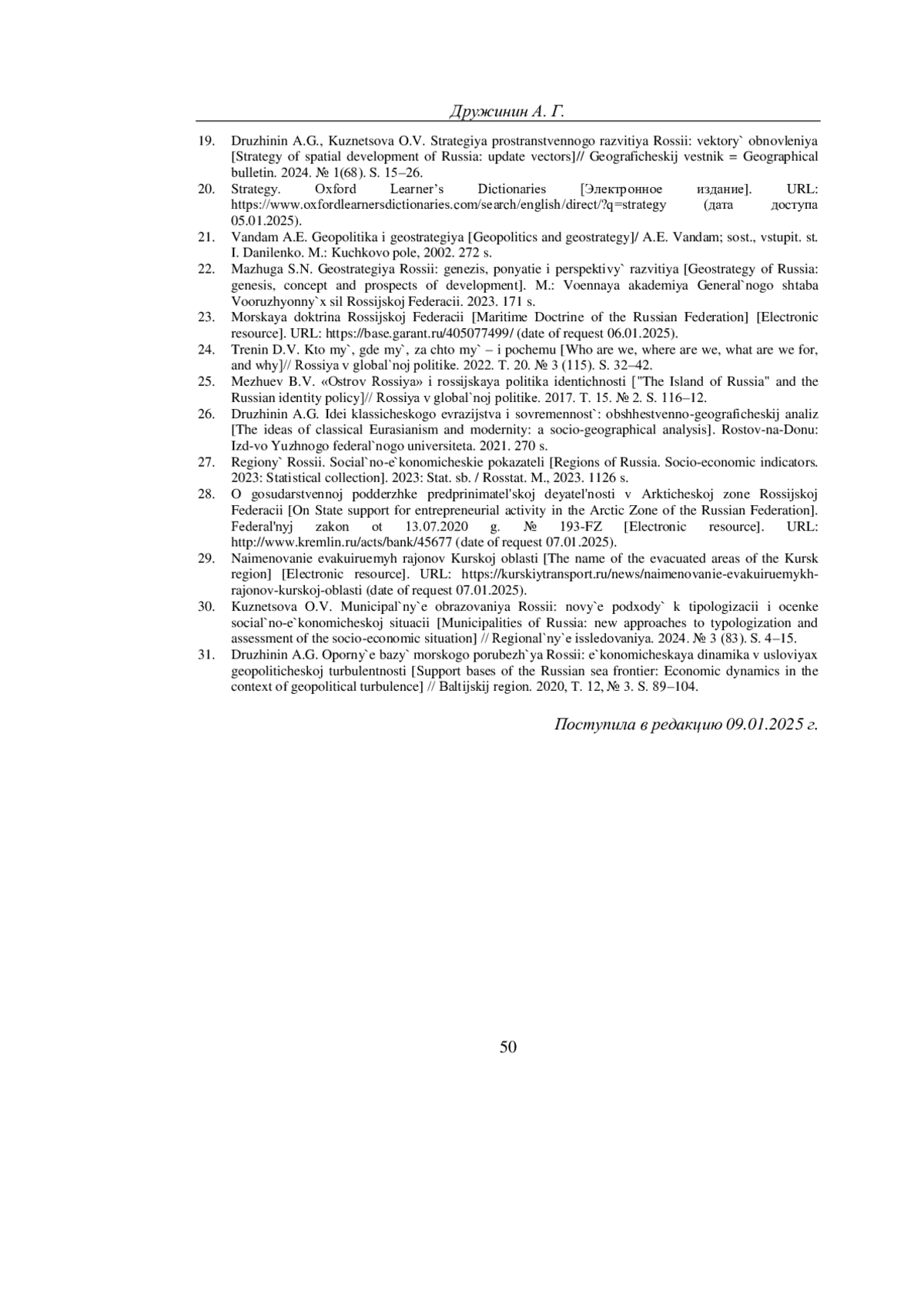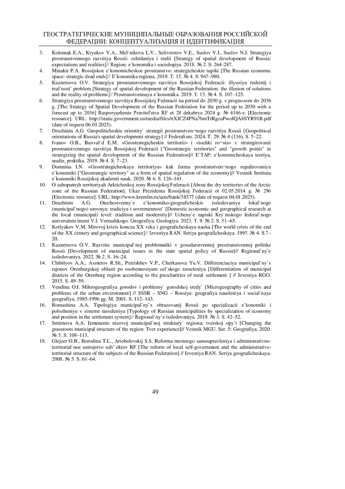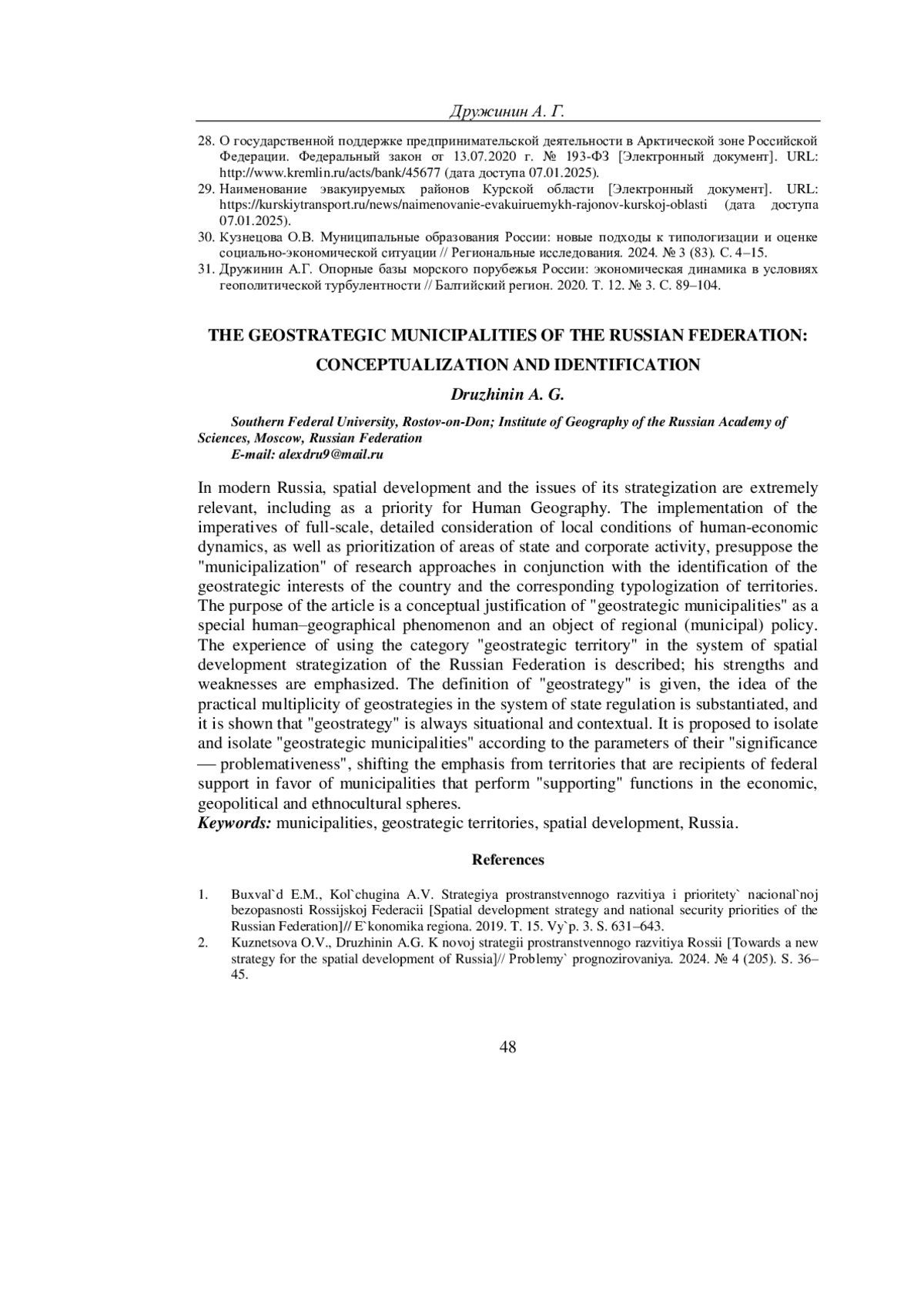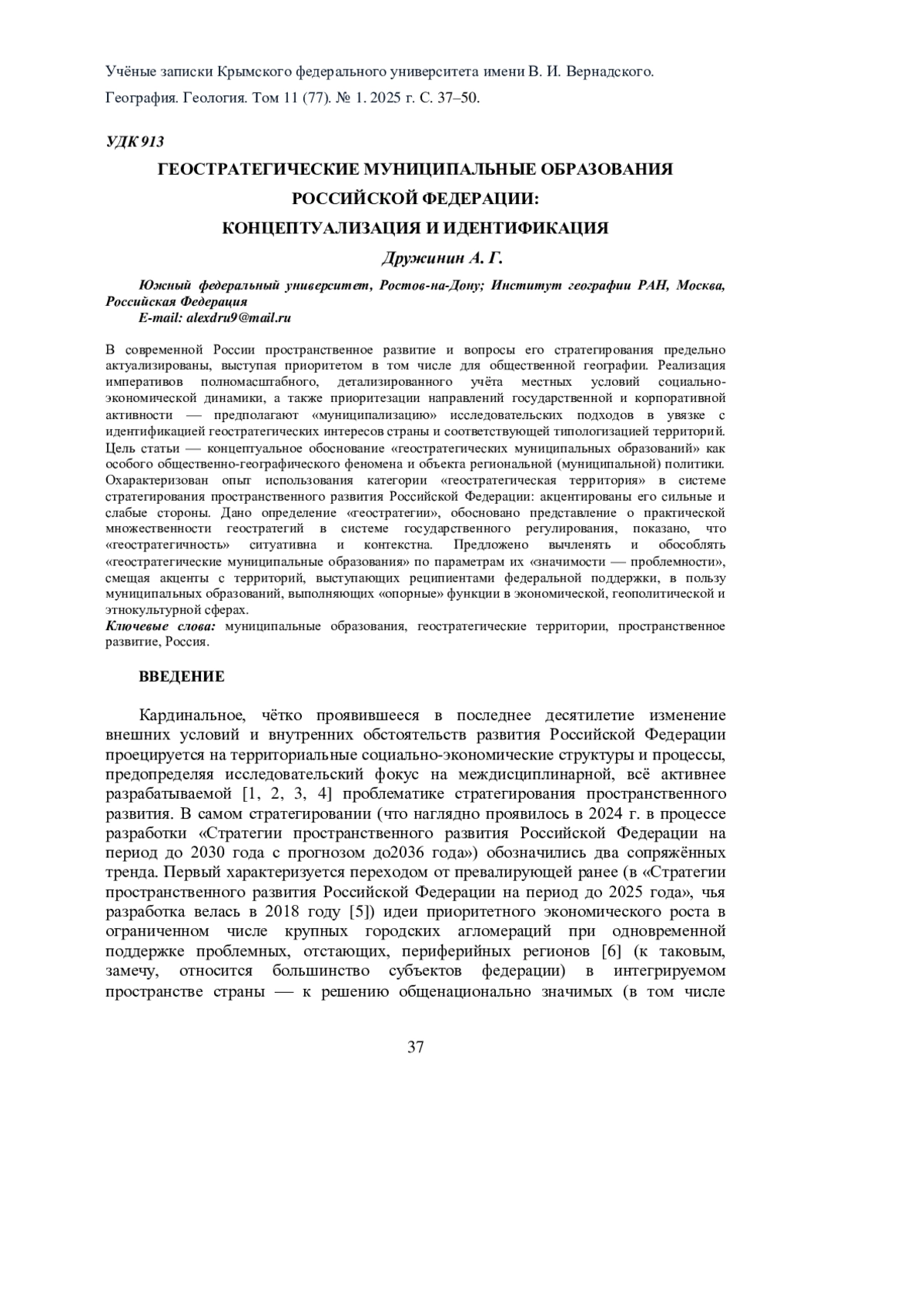 ДРУЖИНИН А. Г. ГЕОСТРАТЕГИЧЕСКИЕ МУНИЦИПАЛЬНЫЕ ОБРАЗОВАНИЯ РОССИЙСКОЙ ФЕДЕРАЦИИ: КОНЦЕПТУАЛИЗАЦИЯ И ИДЕНТИФИКАЦИЯ // УЧЕНЫЕ ЗАПИСКИ КРЫМСКОГО ФЕДЕРАЛЬНОГО УНИВЕРСИТЕТА ИМЕНИ В. И. ВЕРНАДСКОГО. ГЕОГРАФИЯ. ГЕОЛОГИЯ. 2025. ТОМ 11 (77). № 1