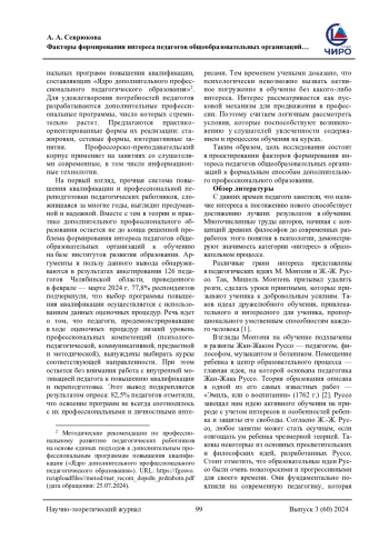 Проблема исследования и обоснование ее актуальности. Познавательный интерес выступает движущей силой обучения личности. В статье констатируется, что сегодня он не всегда учитывается в процессе повышения квалификации педагогов в учреждениях дополнительного профессионального образования. Исходя из этих оснований, актуальность исследования определяется необходимостью поиска действенных средств формирования интереса педагогов к обучению на курсах повышения квалификации. Соответственно, цель исследования состоит в проектировании факторов формирования интереса педагогов общеобразовательных организаций к формальным способам дополнительного профессионального образования. Проводится обзор литературы, посвященной феномену интереса в обучении и способам его формирования у педагогов. Делается вывод о целесообразности разработки специальных средств в рассматриваемом сегменте. В качестве методологических оснований выбраны и аргументированы идеи педагогической теории Джона Дьюи об исключительной важности формировании интереса в обучении, активности обучающегося и метод проектирования. Результатами исследования выступают спроектированные и описанные факторы формирования интереса педагогов к обучению в учреждении дополнительного профессионального образования: на предварительном этапе: осознанность в выборе программы обучения; на начальном этапе: осмысленность результатов исследования, любознательность в осуществлении проспективной рефлексии; на этапе активного обучения: эмоциональность и вовлеченность в занятие; на завершающем этапе: удовлетворенность обучением и желание применять освоенное на курсах в собственной практической деятельности. Научная новизна исследования заключается в выделении и обосновании действия факторов, их влияния на формирование внутреннего и внешней мотивации педагогов к обучению Теоретическая значимость обнаруживается в развитии представлений о совершенствовании дополнительного профессионального образования с использованием факторов формирования интереса педагогов. Практическая значимость связана с возможностью использования описания содержательной наполненности факторов формирования интереса педагогов к обучению в проектировании и проведении занятий со слушателями, осваивающими дополнительные профессиональные программы. Обсуждаются рекомендуемые преподавателям действия, которые поспособствуют успешной реализации спроектированных факторов. Формулируются выводы о проведенном исследовании, излагаются перспективы его развития.
