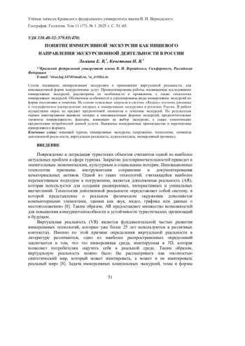 Статья посвящена иммерсионным экскурсиям и применению виртуальной реальности, как инновационной форме экскурсионных услуг. Проанализированы работы, посвященные исследованию иммерсивных экскурсий, рассмотрены их особенности и проявления, а также технологии иммерсивных экскурсий. Обозначены особенности и сгруппированы виды иммерсивных экскурсий по форме постановки и тематике. На основе поисковых запросов в системе «Яндекс» изучены динамика и географическое распределение интереса к иммерсивным экскурсиям в регионах России. В работе осуществлен опрос на предмет предпочтений элементов и тематики экскурсий. По результатам оценки анкетирования выявили: интерес к инновационным формам экскурсий; предпочтительные элементы иммерсивности; факторы, влияющие на выбор экскурсии; а также тематические предпочтения потребителей данной услуги. Выявлены конкурентные преимущества и перспективы иммерсивного формата.