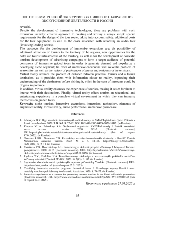 3. Назарова Л.Х., Незнанов Т.Г. Перспективы развития иммерсивных экскурсий в России //Вестник Национальной академии туризма. 2022. № 2. С. 51-54. DOI: 10.51677/2073-0624_2022_62_2_11 EDN: TBKVUL