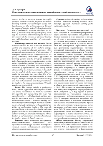 Проблема исследования и обоснование ее актуальности. Проблема исследования и обоснование ее актуальности. Актуальность разработки концепции повышения квалификации и самообразовательной деятельности учителей математики с использованием веб-ориентированных ресурсов обусловлена запросом общества в высококвалифицированных педагогах, владеющих современными методами и технологиями обучения с использованием веб-ориентированных ресурсов. В статье предложена Концепция повышения квалификации и самообразовательной деятельности учителей математики, разработанная на основе анализа существующих концепций обучения, теоретико-методологической основы и сущности процесса повышения квалификации и самообразовательной деятельности учителей математики. Методология (материалы и методы). В статье обоснована необходимость разработки, раскрыто содержание и структура авторской концепции, базирующейся на полипарадигмальном подходе, предполагающим взаимодополнения положений синергетического, системно-деятельностного, компетентностного, логистического, коннективиского, инструментального подходов в обучении, общедидактических принципов (фундаментальности, гуманизации и гуманитаризации, партисипативности, фундирования, оптимальной информационной насыщенности, опережающего характера обучения) и методических условий цифровой дидактики. Ведущим методом исследования представленной в статье проблемы, являлся анализ результатов анкетирования, который позволил выявить вывод, что более 80% опрошенных учителей математики считают необходимым разработку концепции повышения квалификации и их самообразовательной деятельности учителей математики. Выборка исследования включала 278 учителей математики г. Минска. Результаты. Концепция включает блок целеполагания, содержательный, прикладной и диагностический блоки. В статье обоснована необходимость и описан алгоритм реализации цикла «обучение на повышении квалификации - самообразовательная деятельность в межкурсовой период - консультирование в межкурсовой период - обучение на повышении квалификации» как механизм построения индивидуальной траектории повышения квалификации и самообразовательной деятельности учителей математики. Представленные в статье материалы являются научно-педагогическим основанием разработки и апробации дидактической системы повышения квалификации и активизации самообразовательной деятельности учителей математики с использованием веб-ориентированных ресурсов.