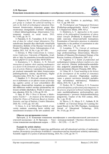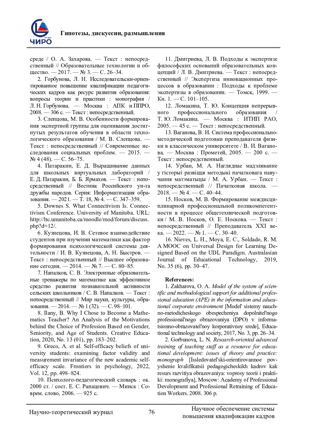 1. Захарова, О. А. Модель системы научно-методического обеспечения дополнительного профессионального образования (ДПО) в информационно-образовательной корпоративной среде / О. А. Захарова. - Текст: непосредственный // Образовательные технологии и общество. - 2017. - № 3. - С. 26-34. EDN: ZRUZOD