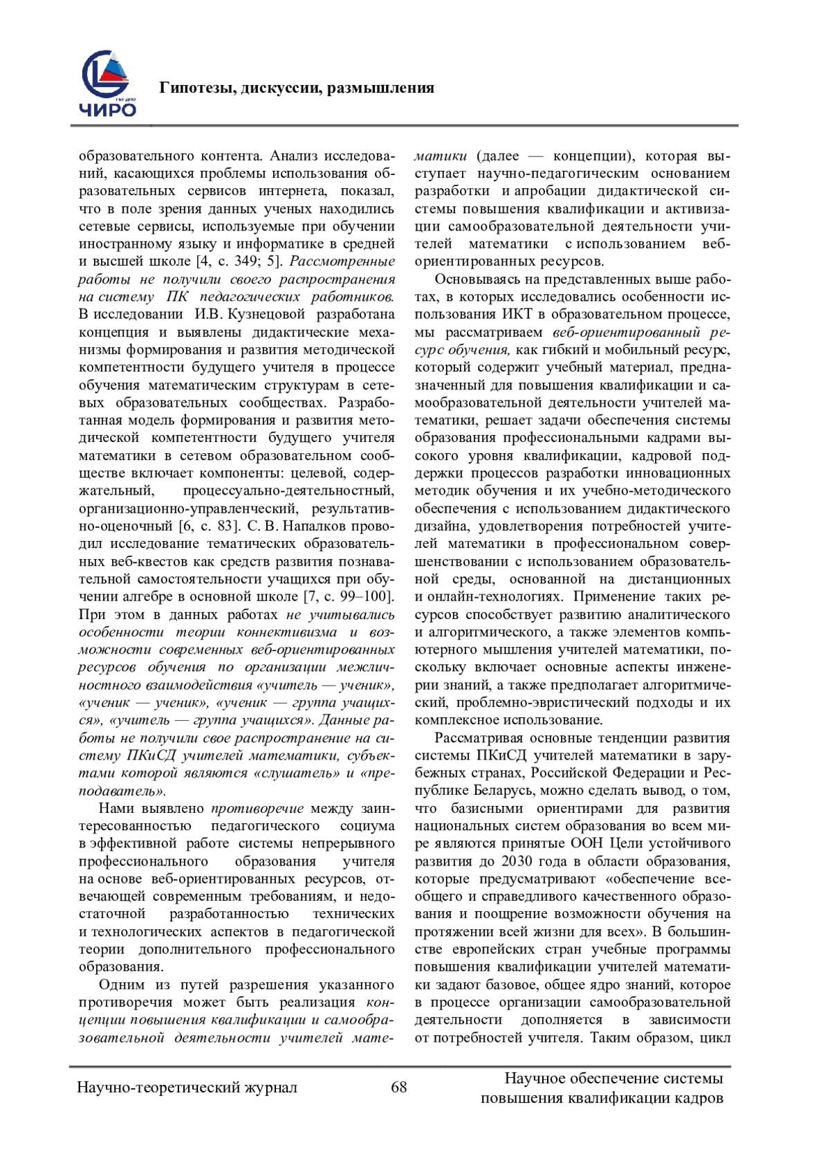 Социально-экономический запрос общества в высококвалифицированных кадрах системы образования, обладающих глубокими знаниями в сфере дидактики и методики обучения и воспитания, лежит в плоскости организации непрерывного повышения квалификации учителей в целом и учителей математики. По действующим нормативным правовым документам, педагогические работники учреждений дошкольного и общего среднего и профессионального образования в Республике Беларусь, должны проходить повышение квалификации не реже 1 раза в 3 года. Исследованию научно-методического обеспечения повышения квалификации и самообразовательной деятельности учителей математики в межкурсовой период (далее — ПКиСД) посвящено немало работ. Например, О. А. Захарова рассматривала особенности организации повышения квалификации учителя в информационнообразовательной корпоративной среде [1, с. 27].