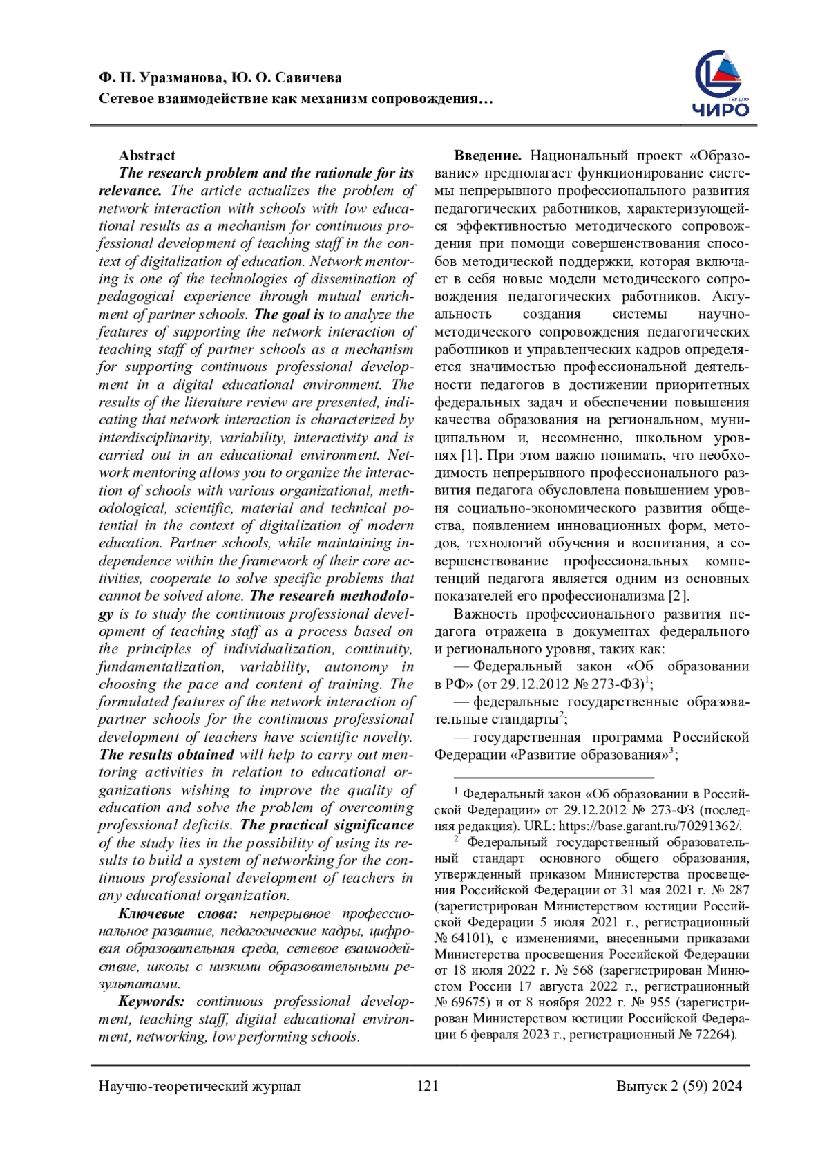 Проблема исследования и обоснование ее актуальности. В статье актуализируется проблема сетевого взаимодействия со школами с низкими образовательными результатами как механизма непрерывного профессионального развития педагогических работников в условиях цифровизации образования. Сетевое наставничество является одной из технологий диссеминации педагогического опыта через взаимообогащение школ-партнеров. Ставится цель анализа особенностей сопровождения сетевого взаимодействия педагогических работников школ-партнеров как механизма сопровождения непрерывного профессионального развития в условиях цифровой образовательной среды. Приводятся результаты обзора литературы, свидетельствующие о том, что сетевое взаимодействие характеризуется междисциплинарностью, вариативностью, интегративностью и осуществляется в образовательной среде. Сетевое наставничество позволяет организовать взаимодействие школ с различным организационным, методическим и научным, материально-техническим потенциалом в условиях цифровизации современного образования. Школы-партнеры, сохраняя независимость в рамках своей основной деятельности, взаимодействуют для решения конкретных проблем, решить которые невозможно в одиночку. Методология исследования состоит в исследовании непрерывного профессионального развития педагогических работников как процесса, базирующегося на принципах индивидуализации, непрерывности, фундаментализации, вариативности, автономии в выборе темпа и содержания обучения. Научной новизной обладают сформулированные особенности сетевого взаимодействия школ-партнеров для непрерывного профессионального развития педагогов. Полученные результаты помогут осуществлять наставническую деятельность по отношению к образовательным организациям, желающим улучшить качество образования и решить проблему преодоления профессиональных дефицитов. Практическая значимость исследования заключается в возможности применения его результатов для выстраивания системы сетевого взаимодействия для непрерывного профессионального развития педагогических работников в любой образовательной организации.